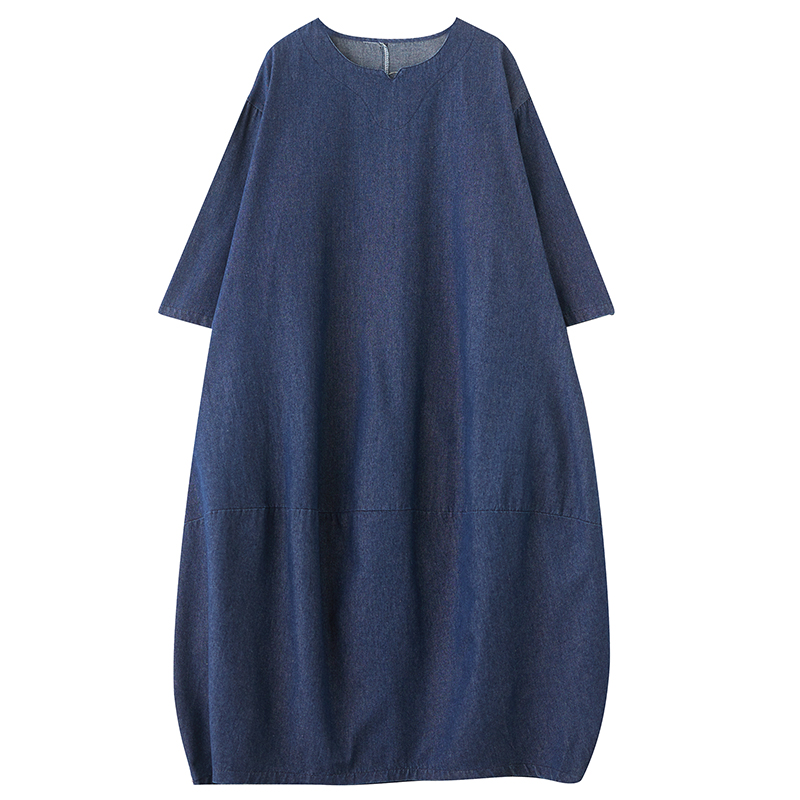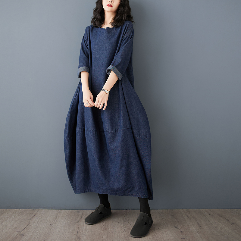 复古长袖牛仔连衣裙早春新款文艺大码宽松女装休闲显瘦加长裙蓝色