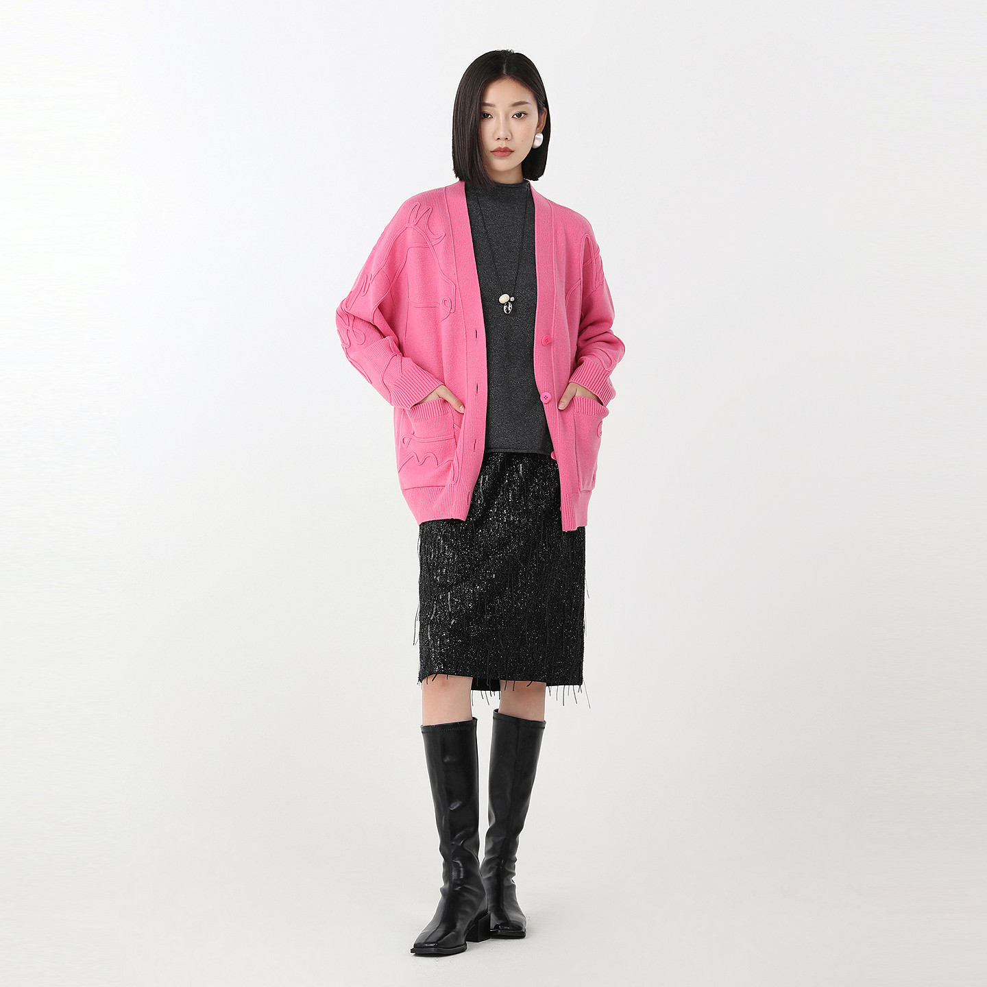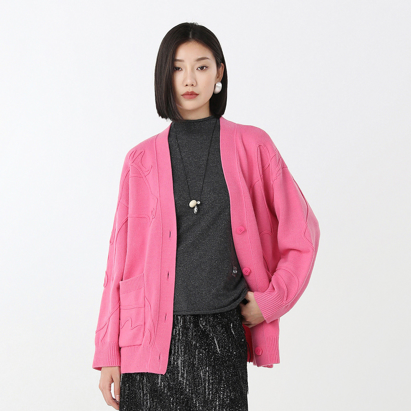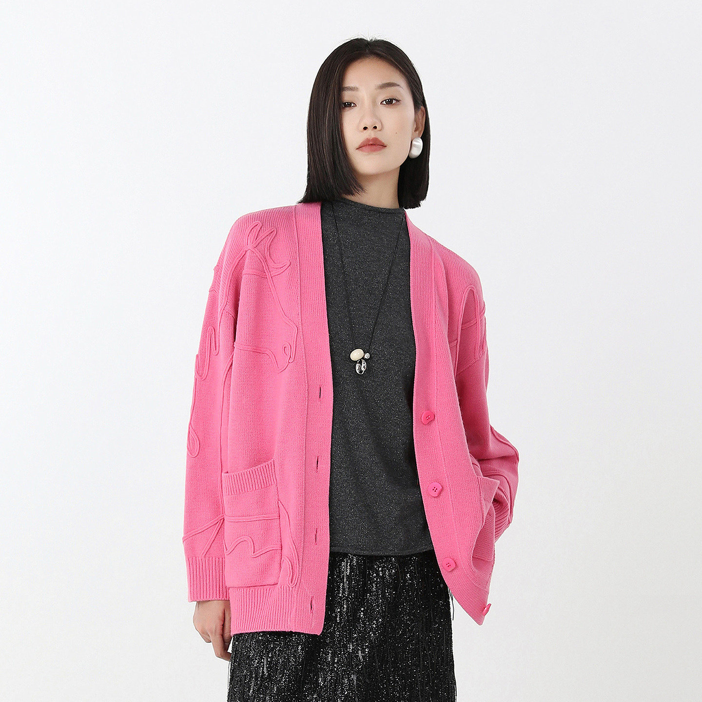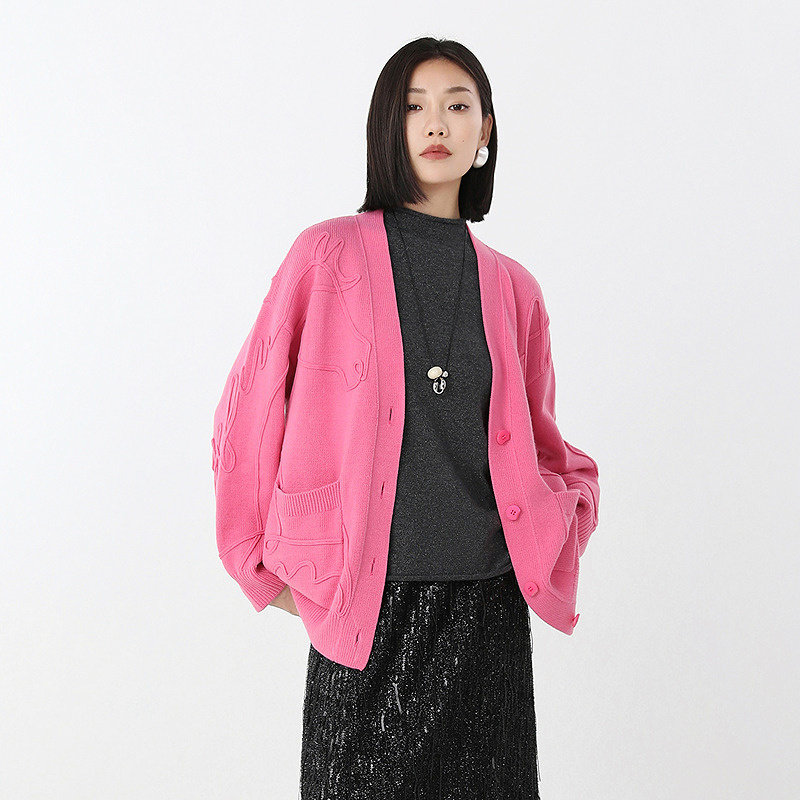 易菲新年红立体感宽松针织开衫