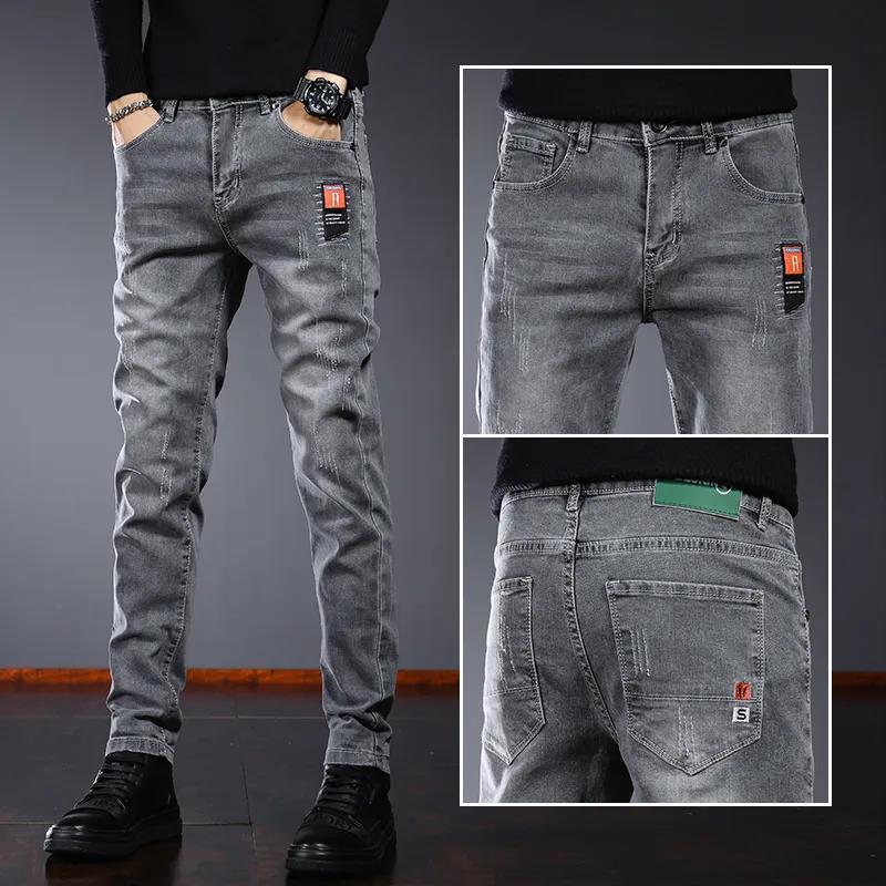 干活的男士牛仔裤烟灰色修身小脚高弹力直筒休闲百搭长裤子男款潮
