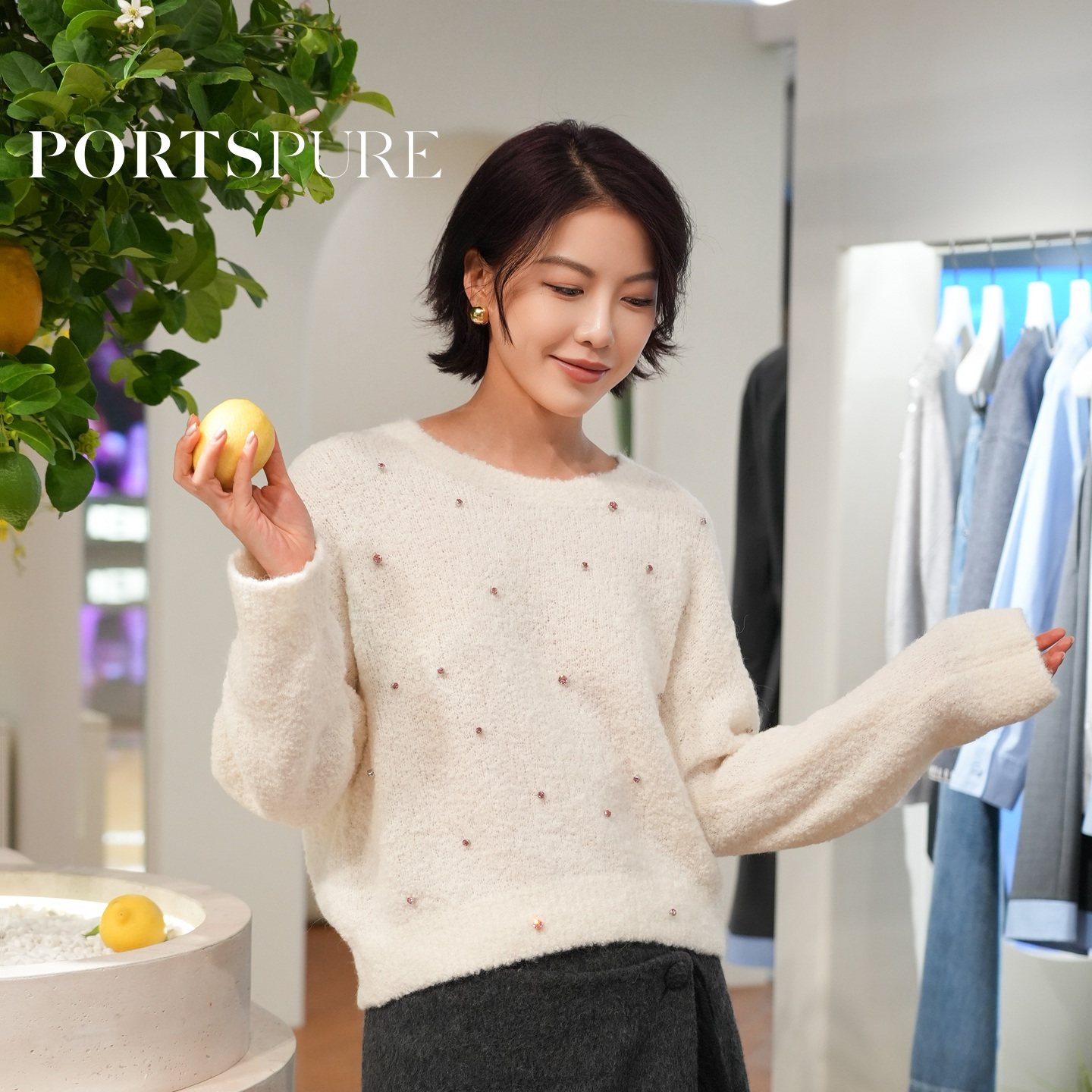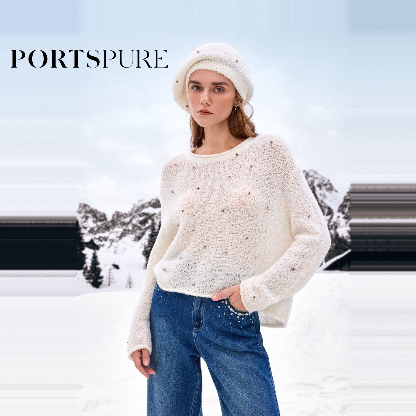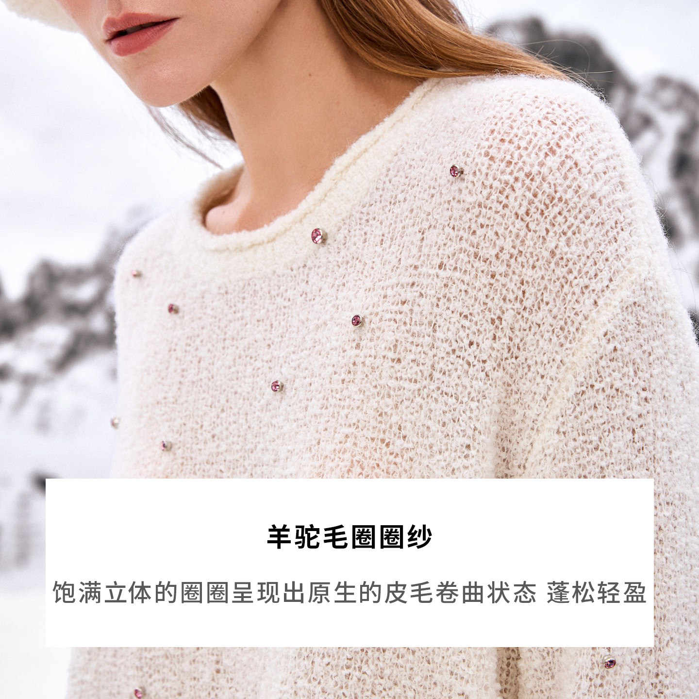 商场同款 宝姿PORTSPURE女装2025秋冬新品软糯慵懒水钻毛绒针织衫