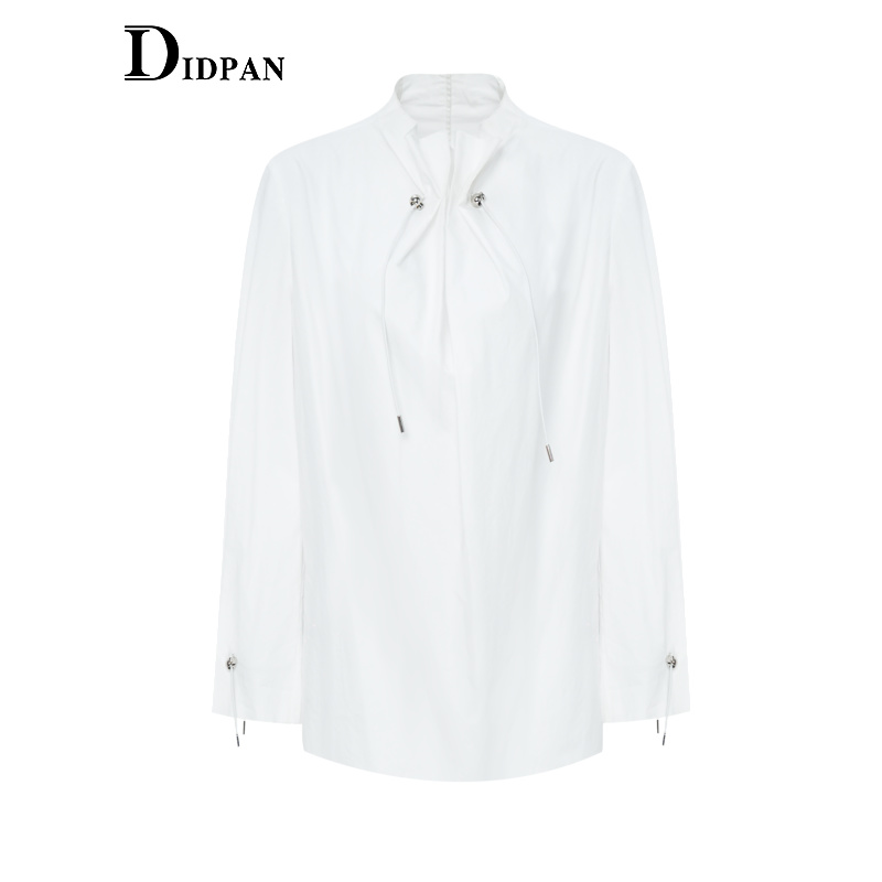 IDPAN长袖上衣冬季新款时尚通勤气质高领纯棉个性抽绳衬衫女