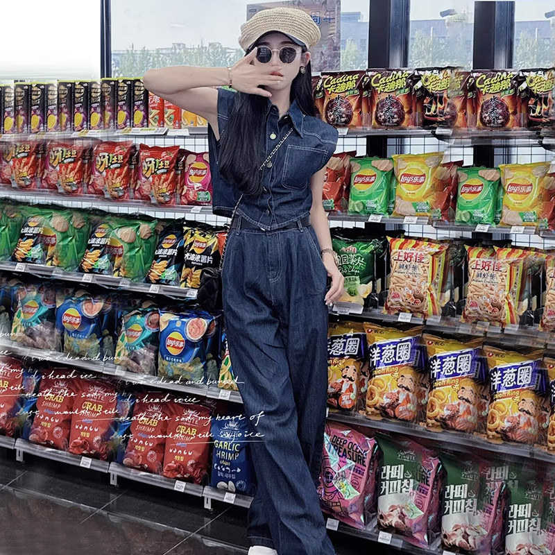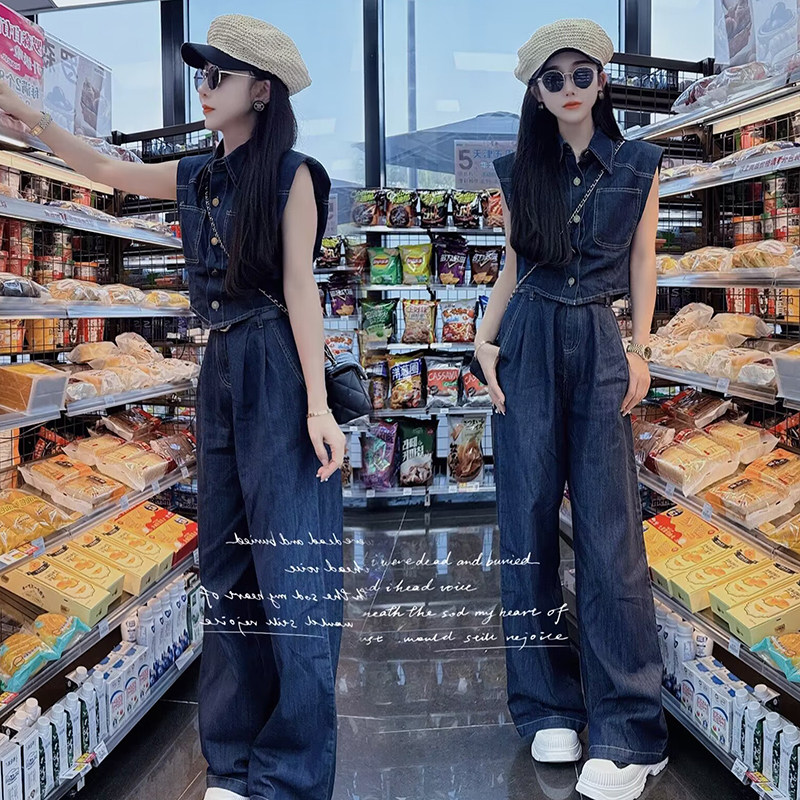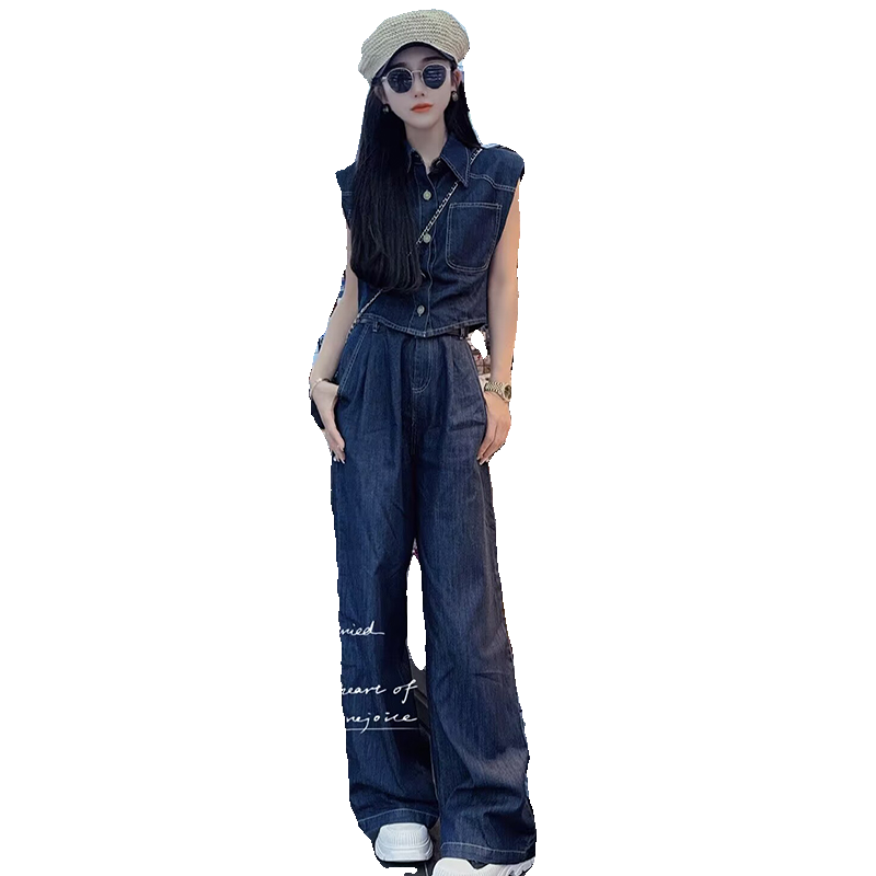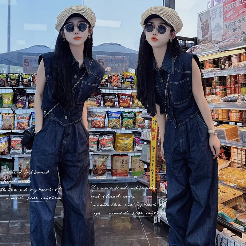 韩版休闲时尚牛仔套装女夏新款洋气复古无袖衬衫直筒阔腿裤两件套