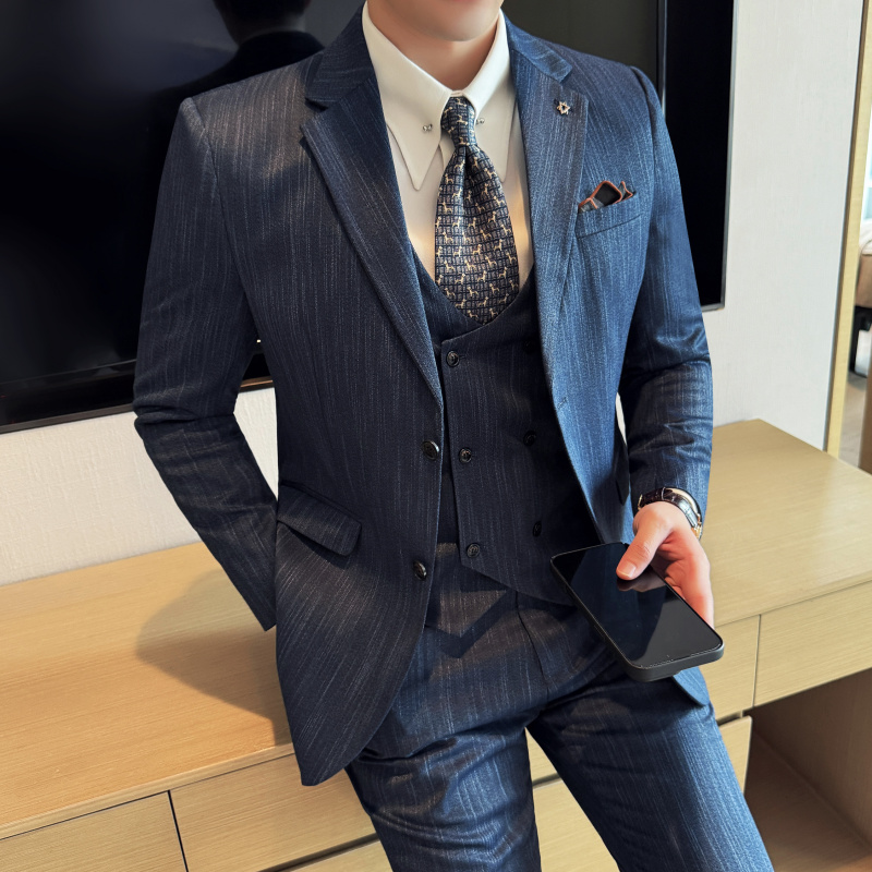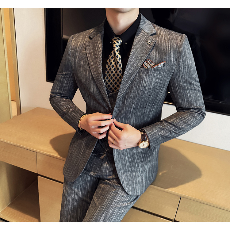 秋季男士商务休闲时尚条纹花西装套装修身时尚新郎结婚礼服西服男