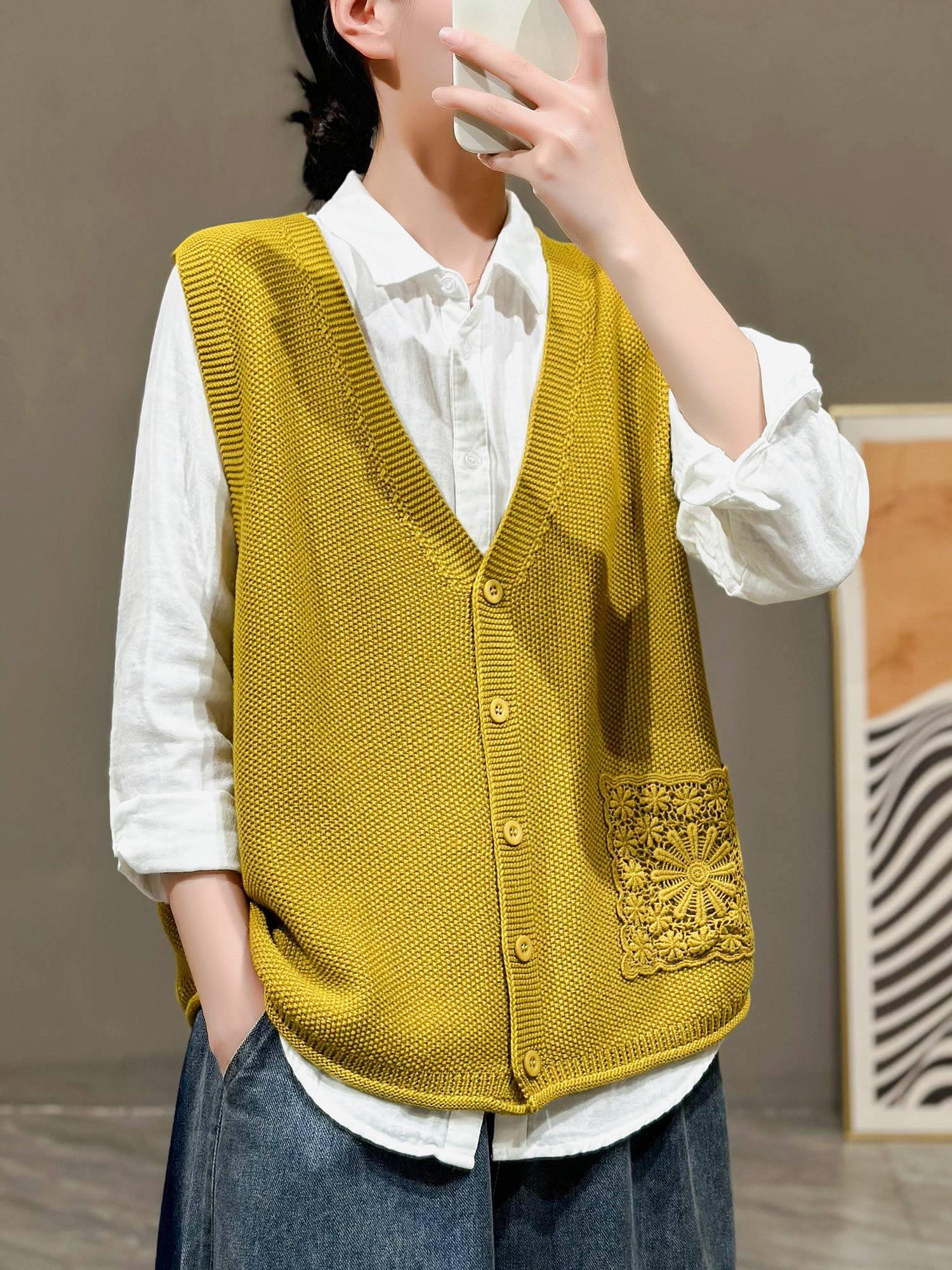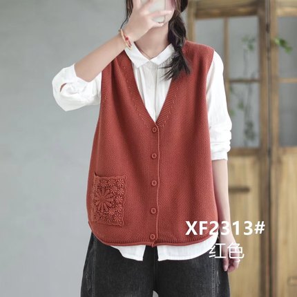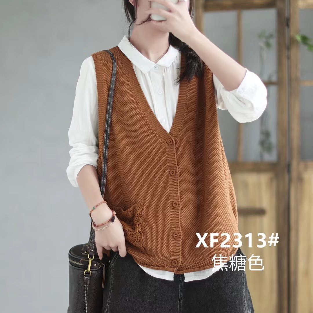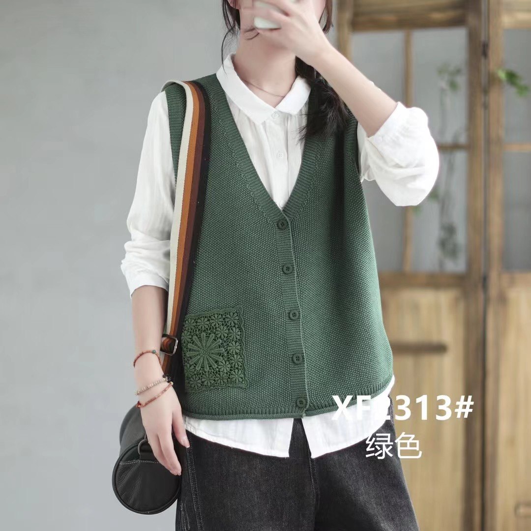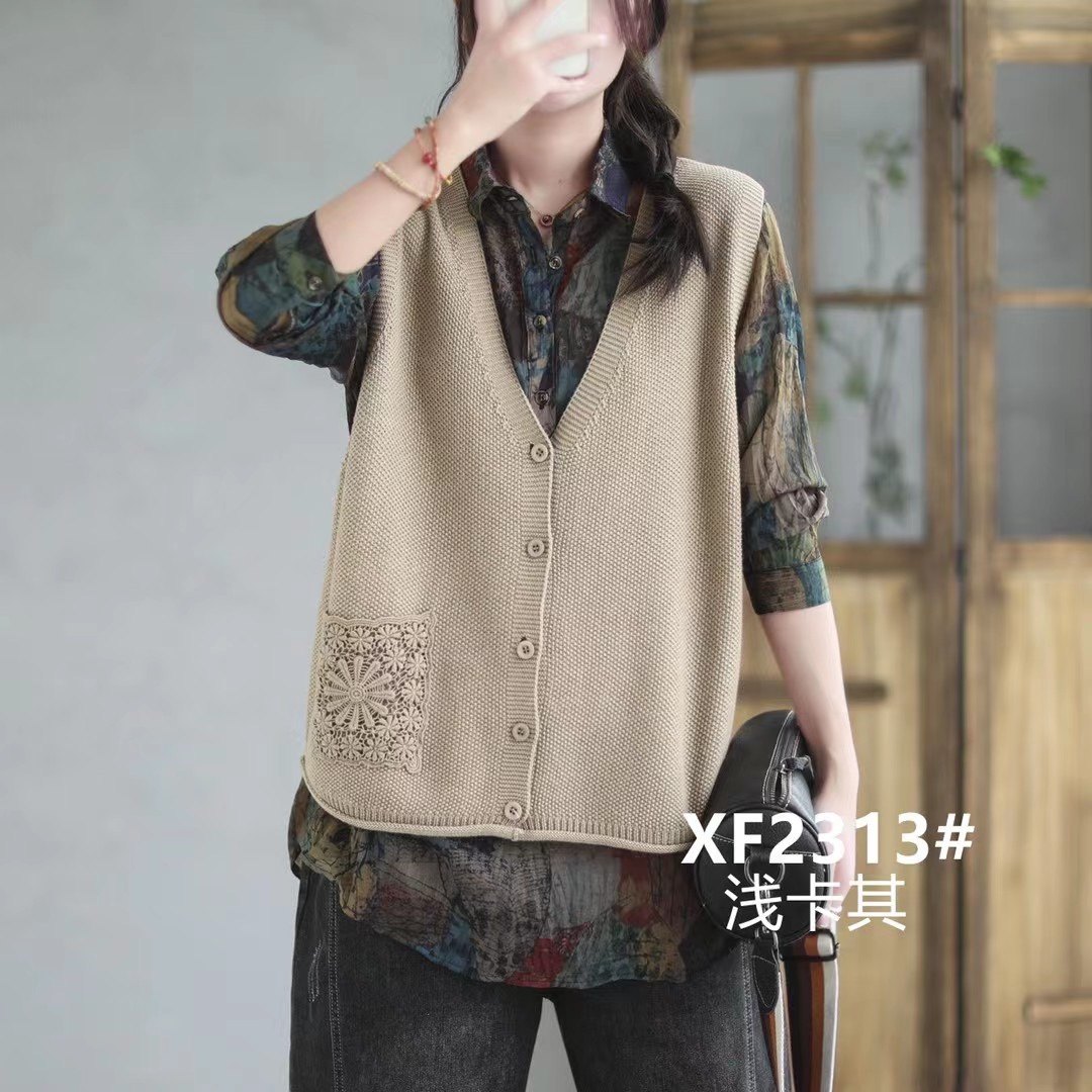 蕾丝拼接V领针织马甲背心女秋季文艺休闲纯色无袖坎肩毛衣上衣
