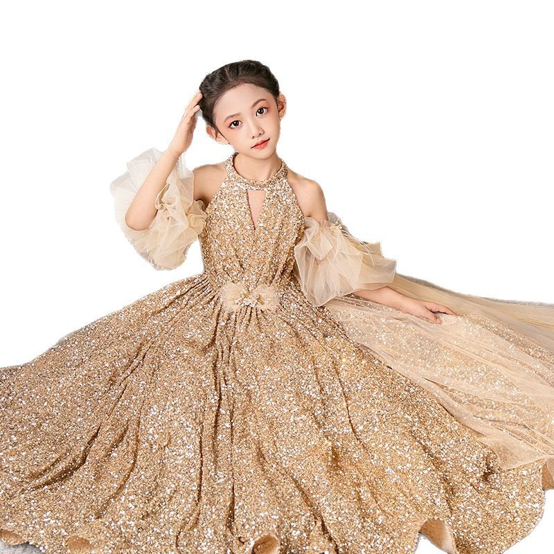 25秋季新款金色亮片儿童礼服走秀潮流童时尚女童主持人礼服连衣裙