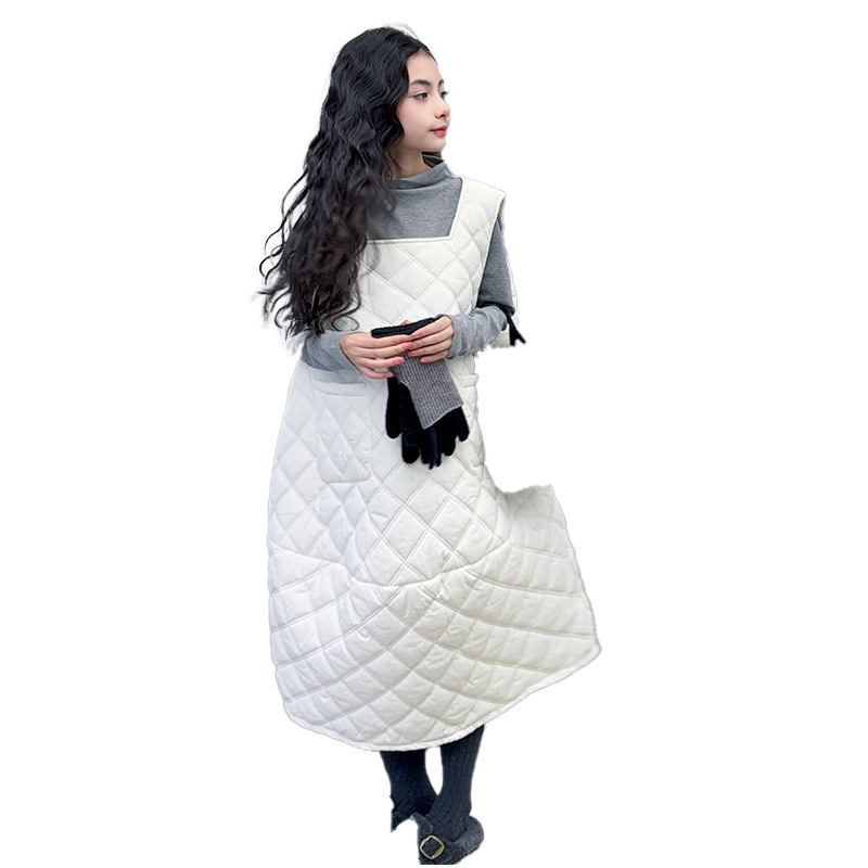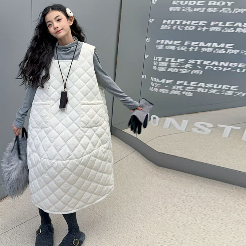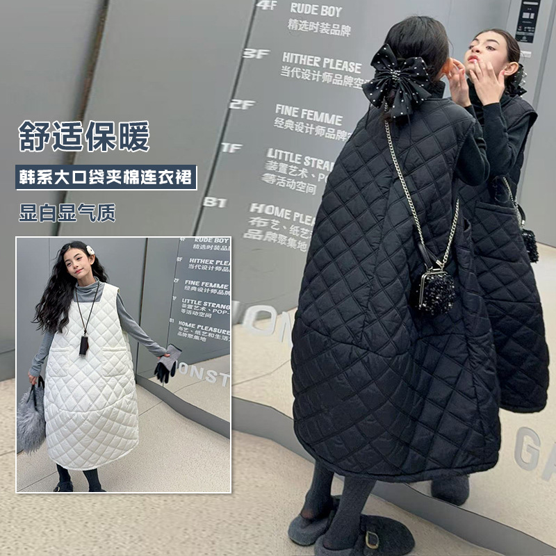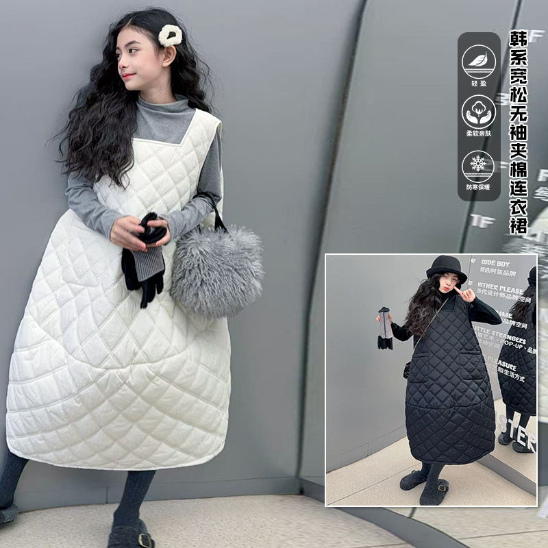 女童裙子秋冬款宽松时髦慵懒风保暖大口袋菱格夹棉背心裙儿童棉裙