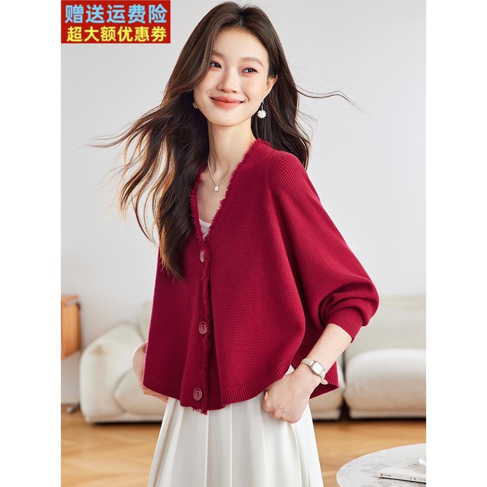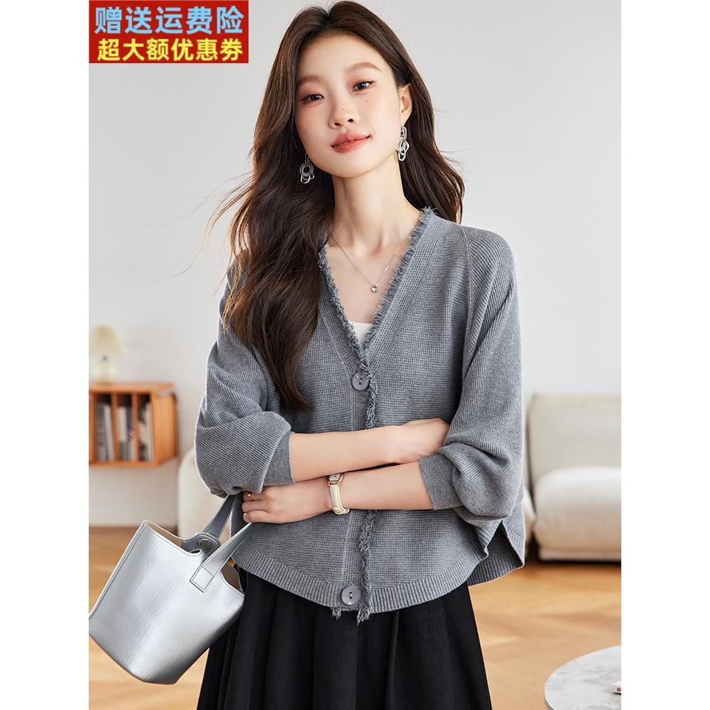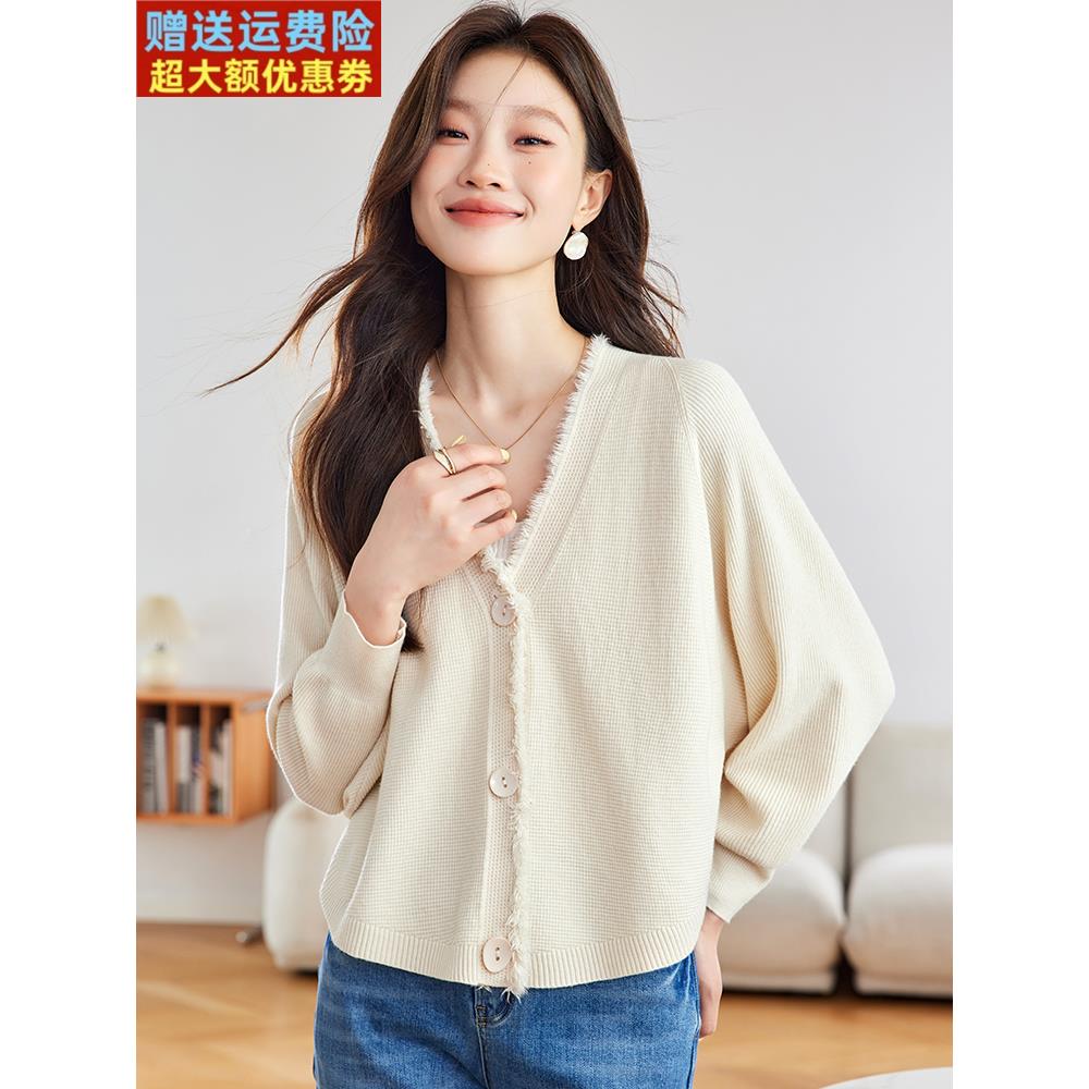 早秋季新款V领针织开衫女小个子短款时尚流苏宽松显瘦蝙蝠衫上衣