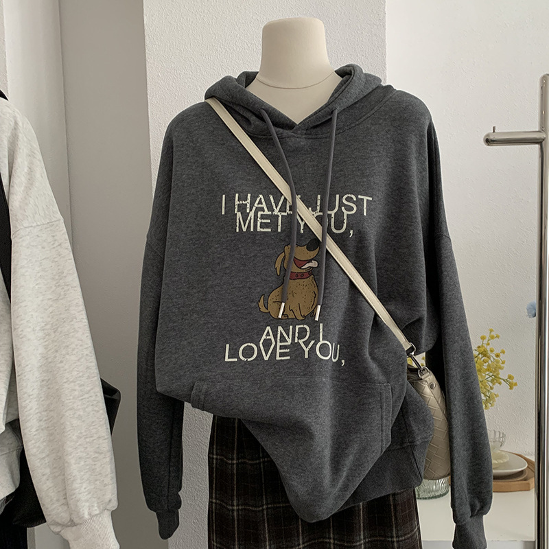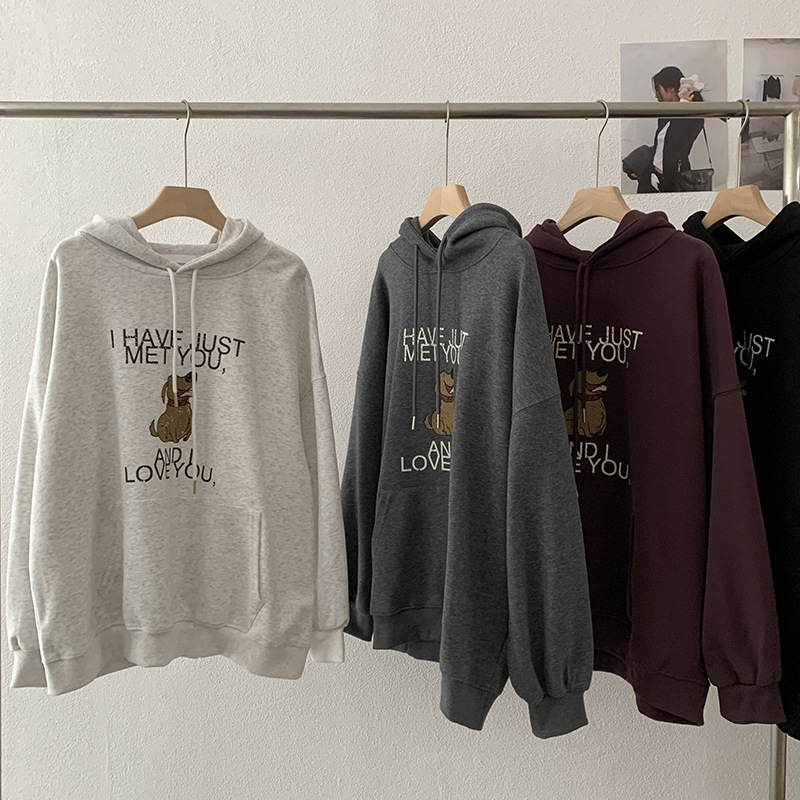 欧玛莱 卡通小狗字母印花连帽宽松中长款长袖套头卫衣实拍女