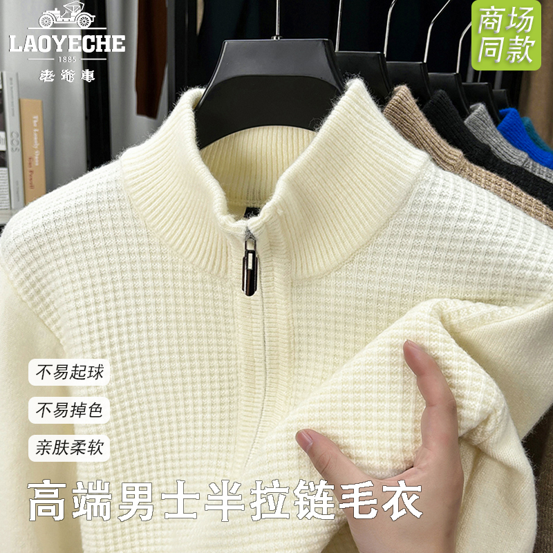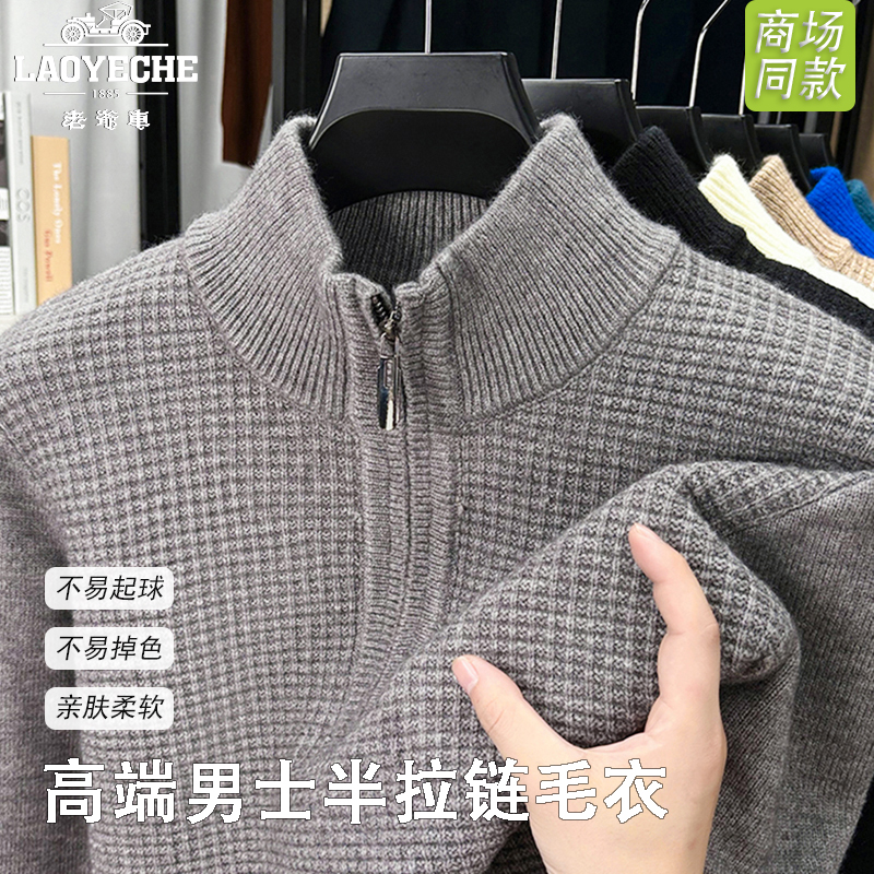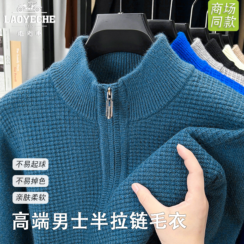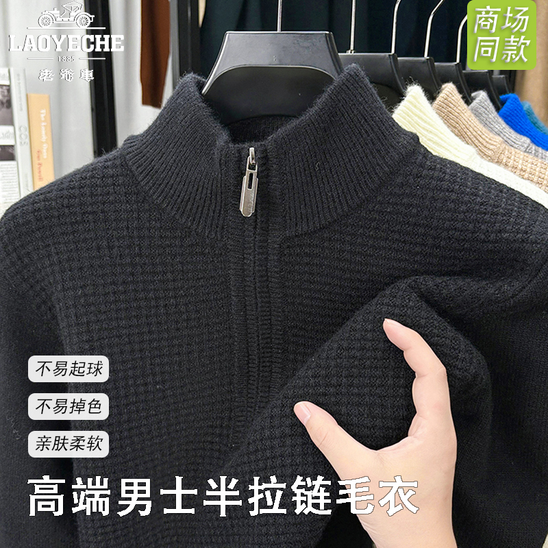 老爷车男士半高拉链针织衫冬季新款高档提花加厚毛衣中年爸爸冬装