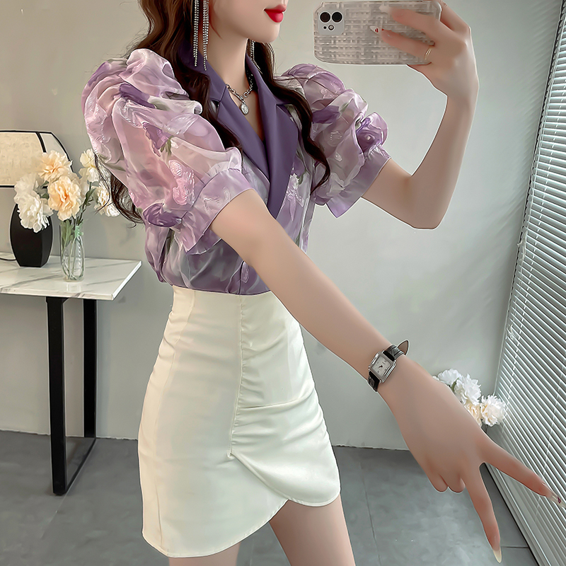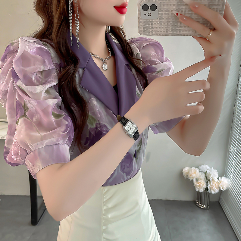 紫色碎花仙气显白雪纺衬衫上衣女夏大码设计感西装领泡泡短袖衬衣