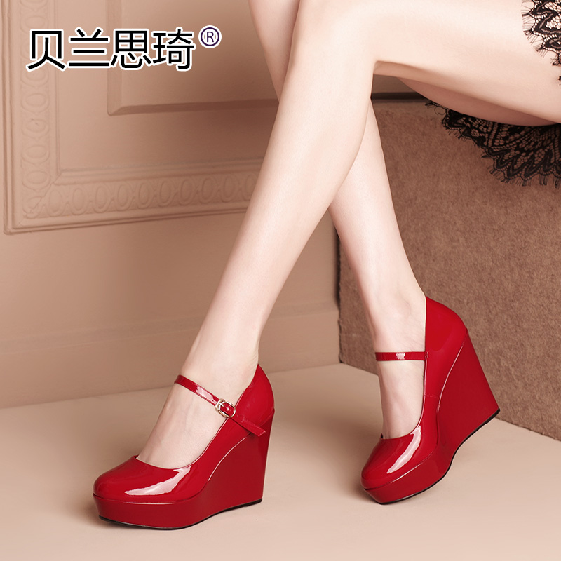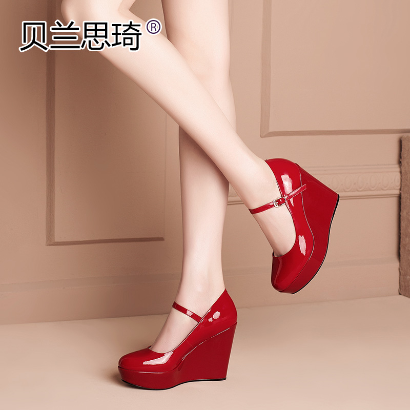 真皮一字带厚底坡跟单鞋女圆头春季新款红色漆皮防水台高跟鞋