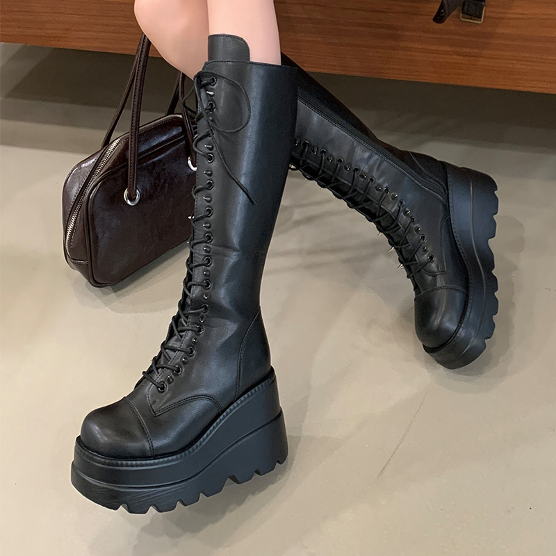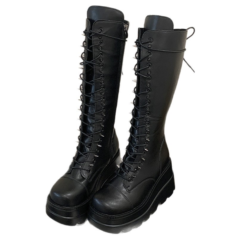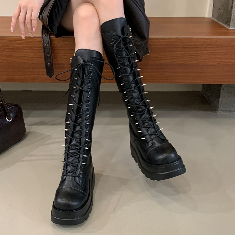 2025年秋季新款厚底骑士靴女英伦风复古长靴子铆钉坡跟高跟鞋女鞋