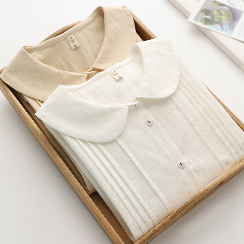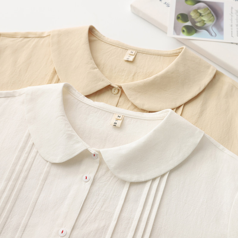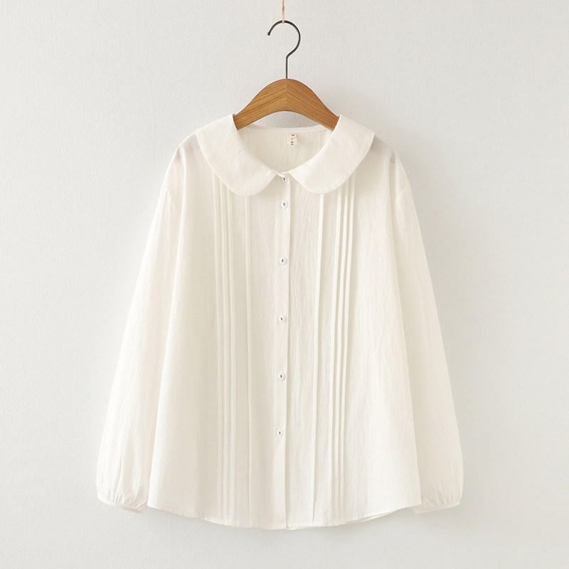 2025春季新品白色长袖衬衫女宽松文艺大娃娃领风琴褶纯棉衬衣上衣