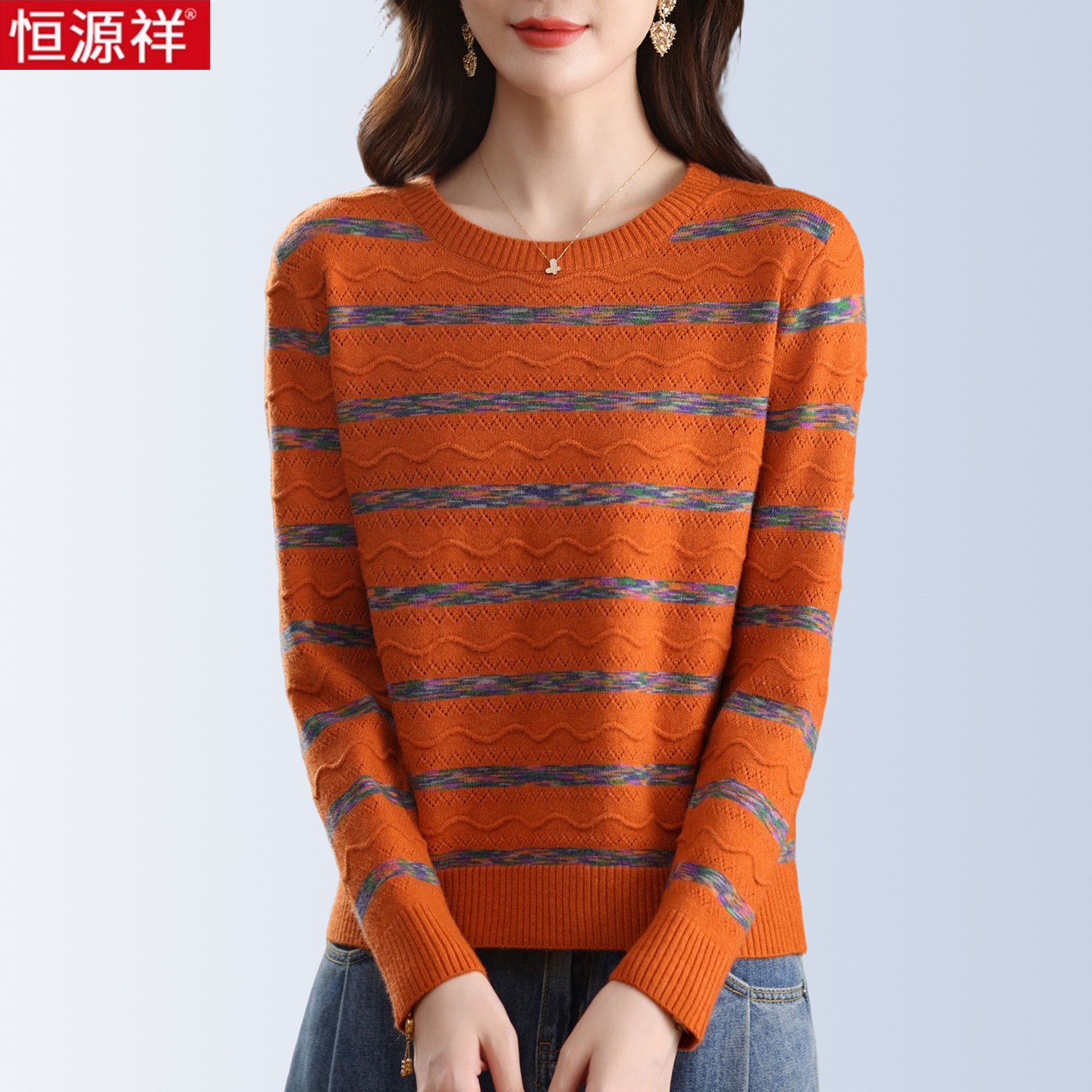 恒源祥秋冬新款针织羊毛衫女圆领套头条纹提花宽松外穿打底毛衣