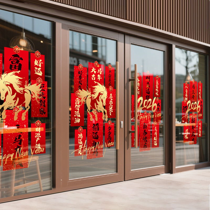 新年装饰节日银行店面2026贴纸元旦跨年过年春节马年玻璃窗花静电