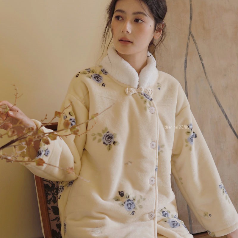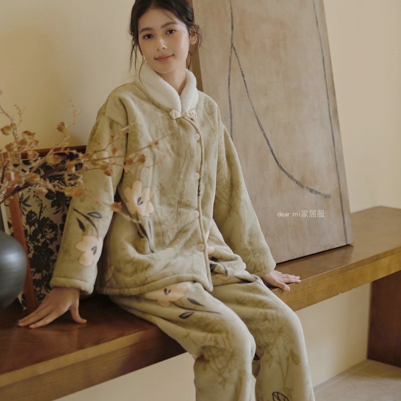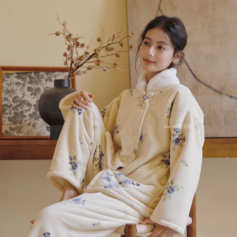 古风花韵睡衣女冬季珊瑚绒加厚保暖新中式国风羊羔法兰绒家居服