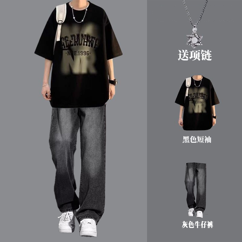 短袖t恤男生一整套穿搭套装纯棉体恤宽松潮流美式休闲上衣服夏季