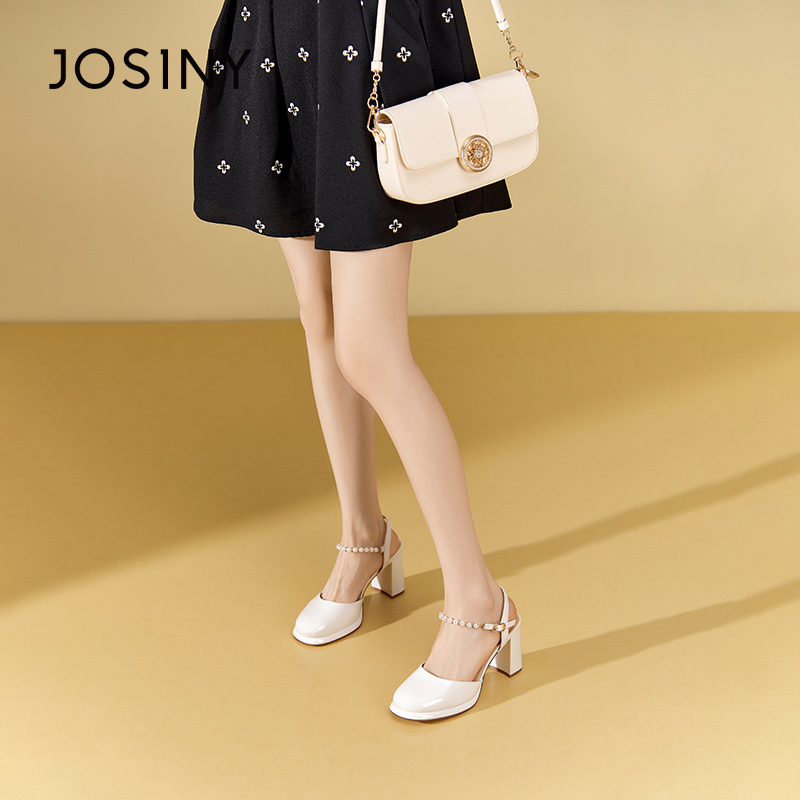 卓诗尼夏季撤柜正品女包头后空凉鞋圆头粗跟珍珠一字扣带玛丽珍写