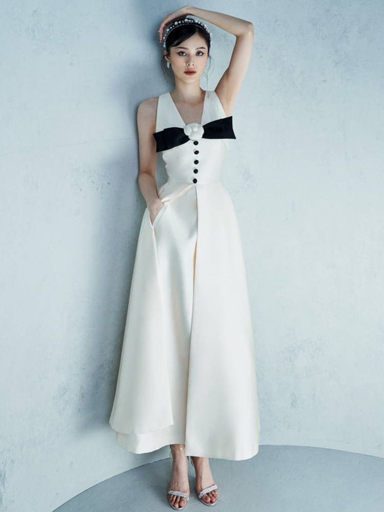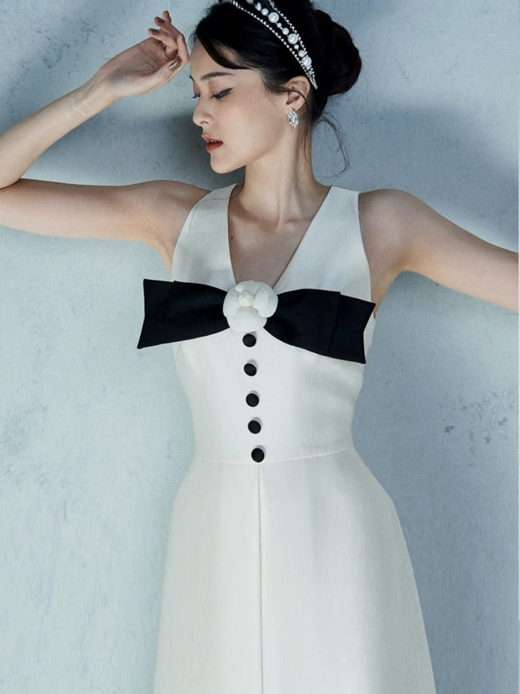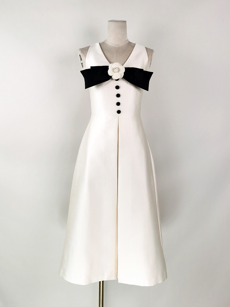 高级感无袖连衣裙设计师新款气质黑白v领法式收腰显瘦女神范长裙