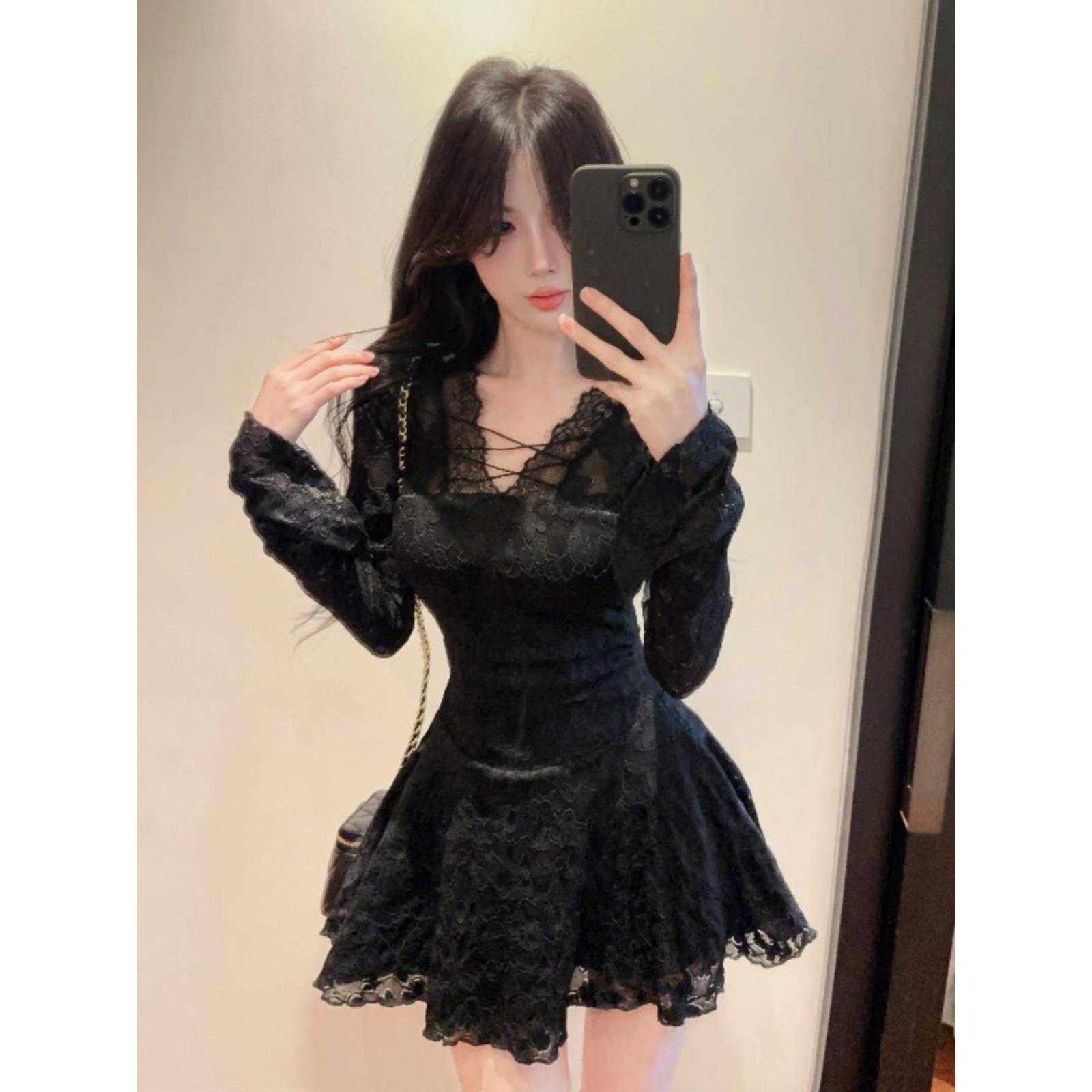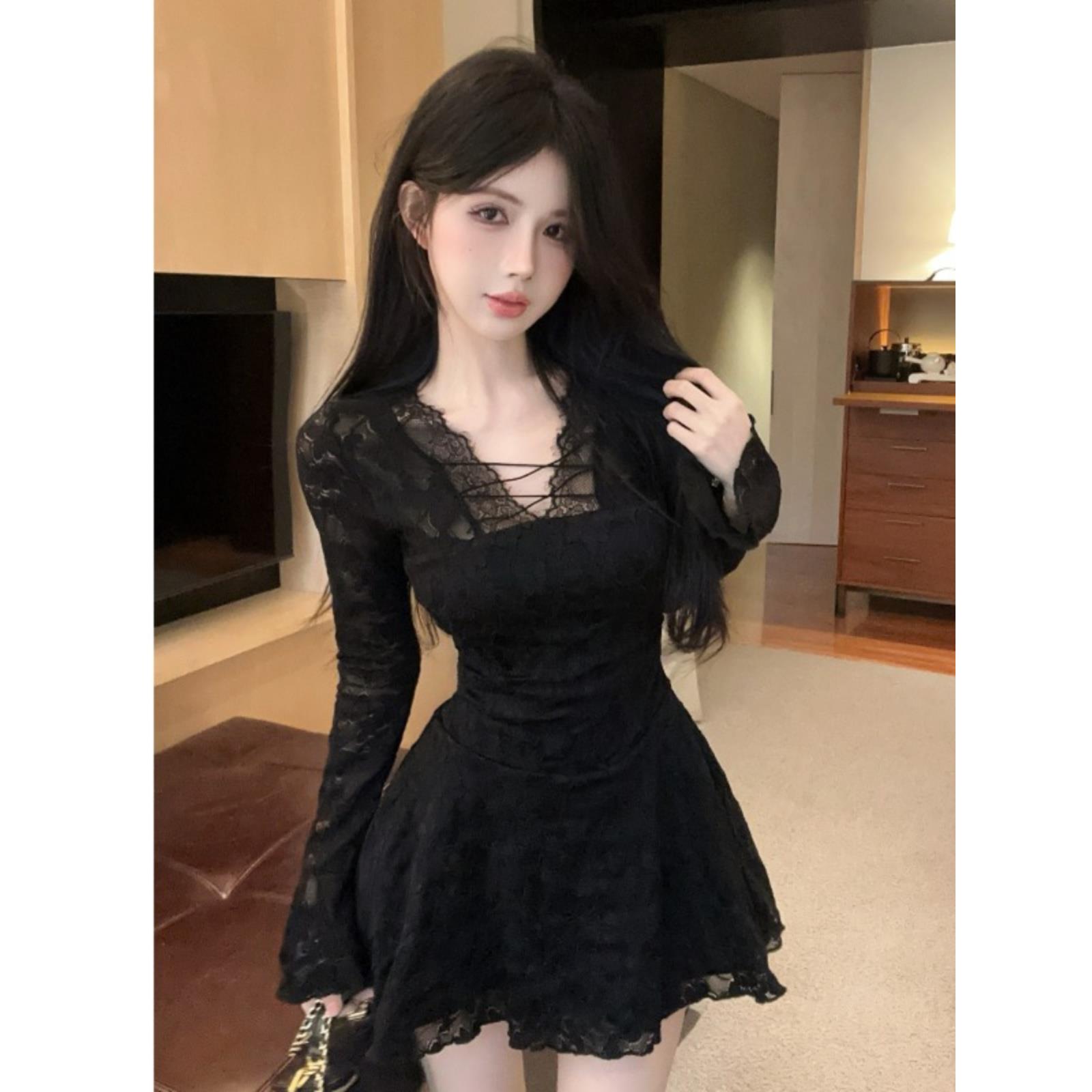 纯欲风辣妹性感V领蕾丝修身连衣裙掐腰小黑裙秋天配大衣的短裙子