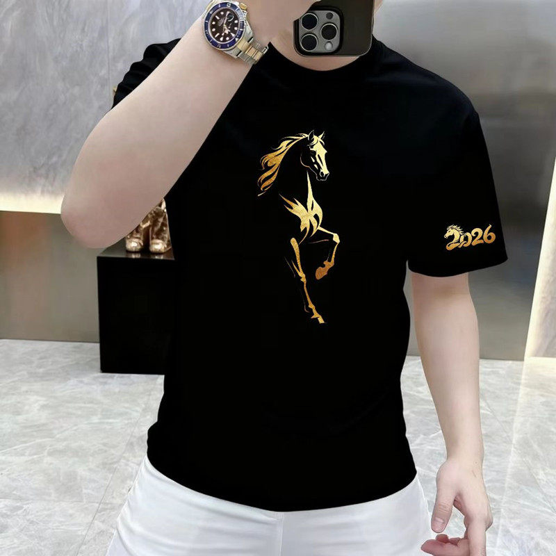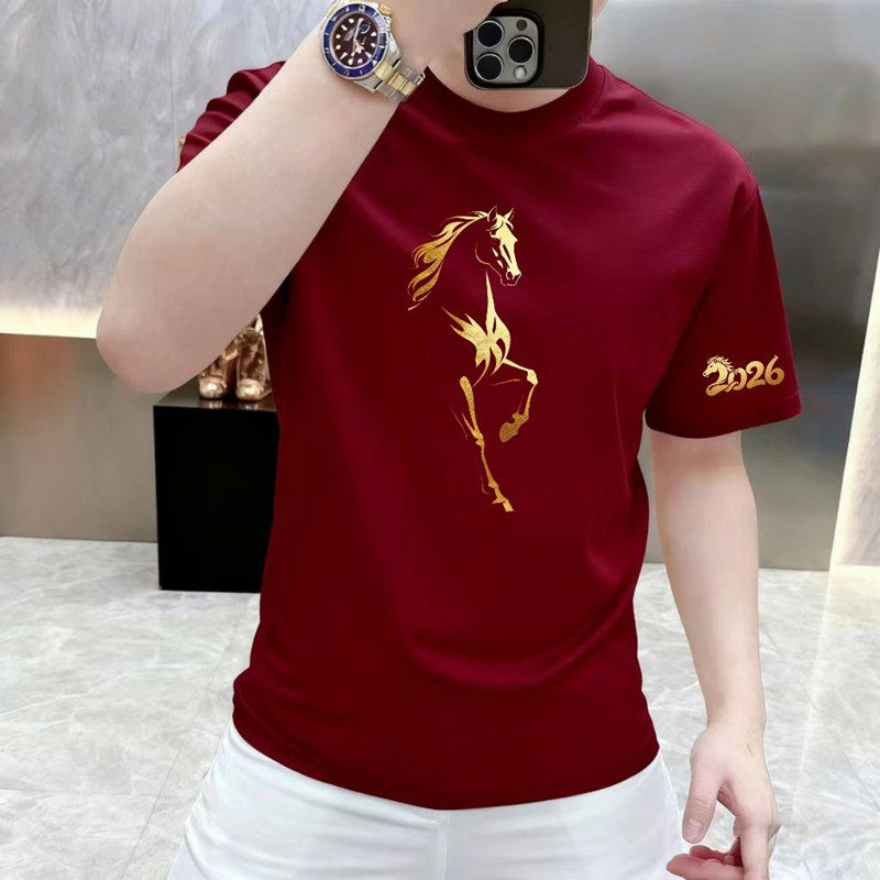 纯棉红色马短袖T恤休闲本命年男潮流时尚高级感圆领半袖打底上衣