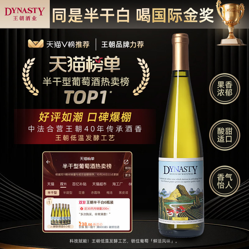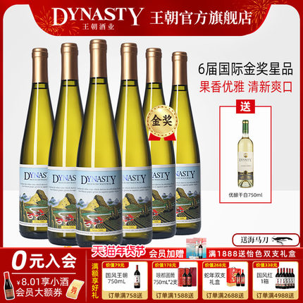 家宴爆款!王朝官方DYNASTY金奖二代半干白葡萄酒6瓶装旗舰店正品