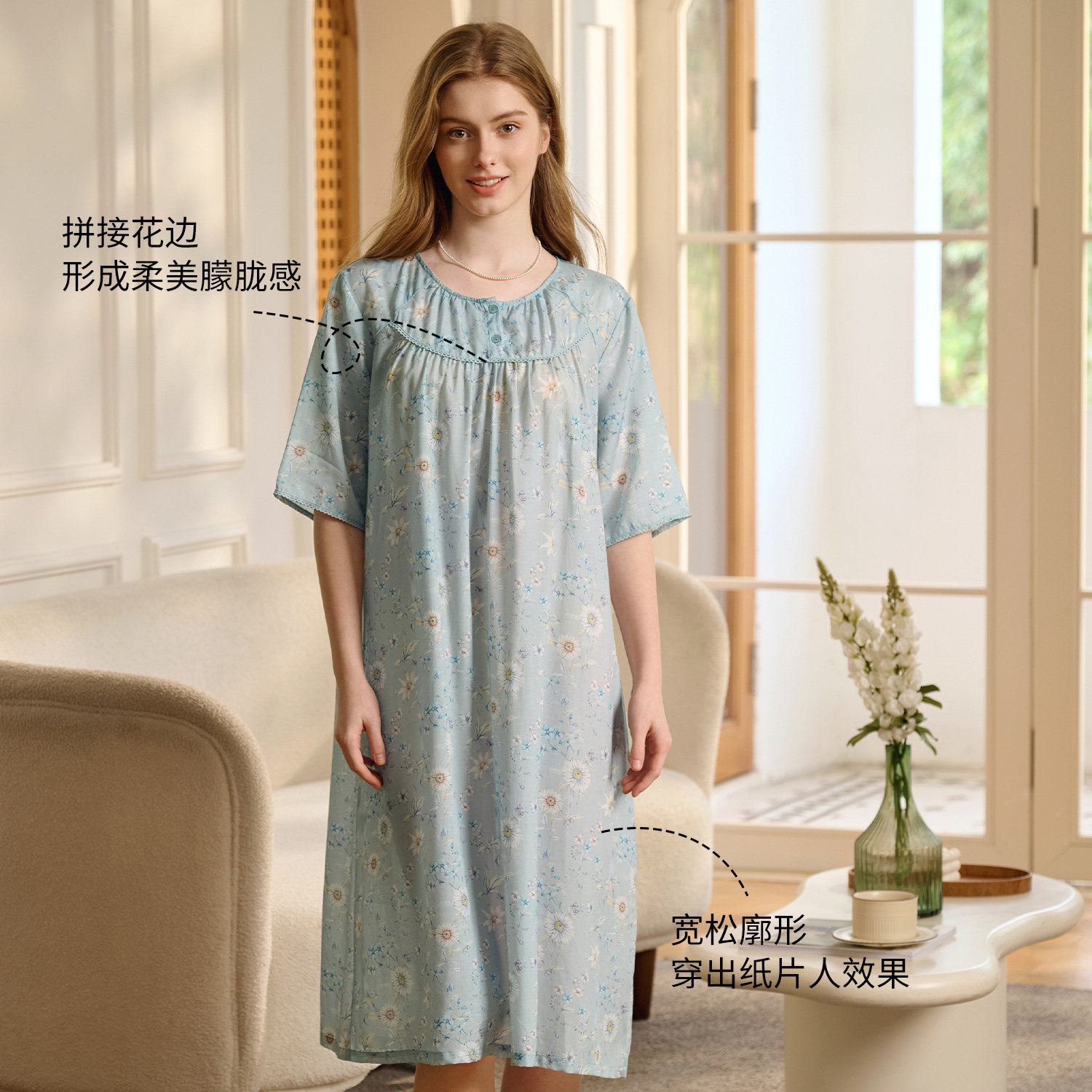 秋鹿睡裙女士10A抗菌法式宽松廓形碎花边拼接2026春夏新款家居服