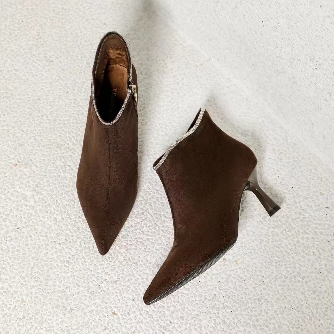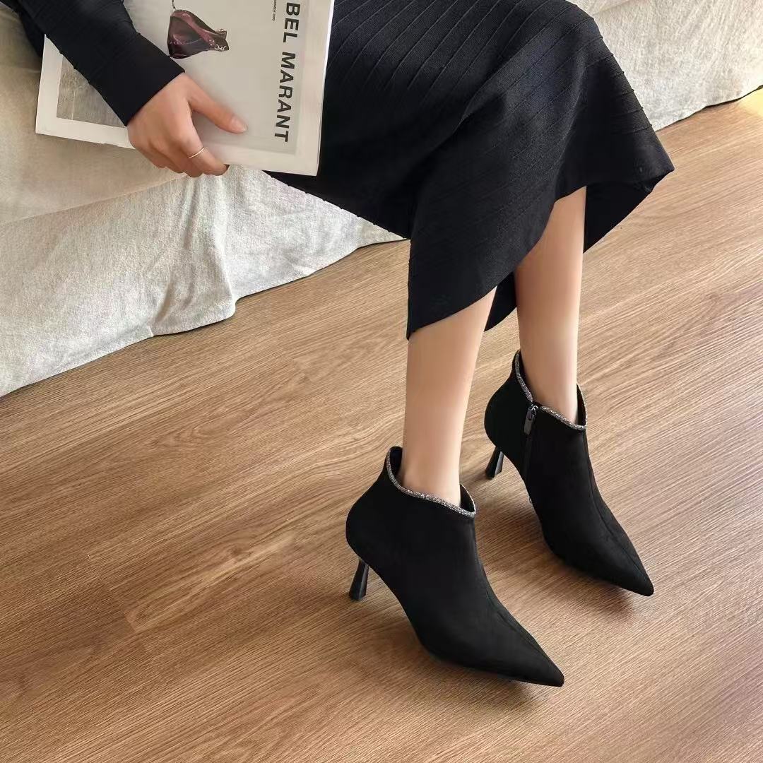 气质尖头细跟水钻时装高跟短靴女2025秋季新款侧拉链羊京绒瘦瘦靴