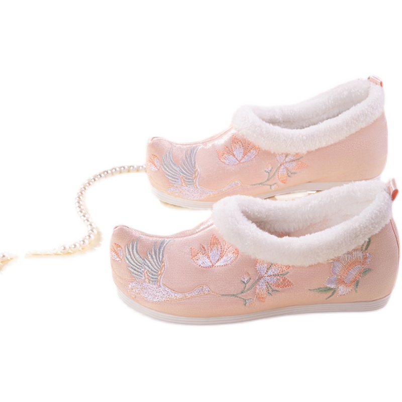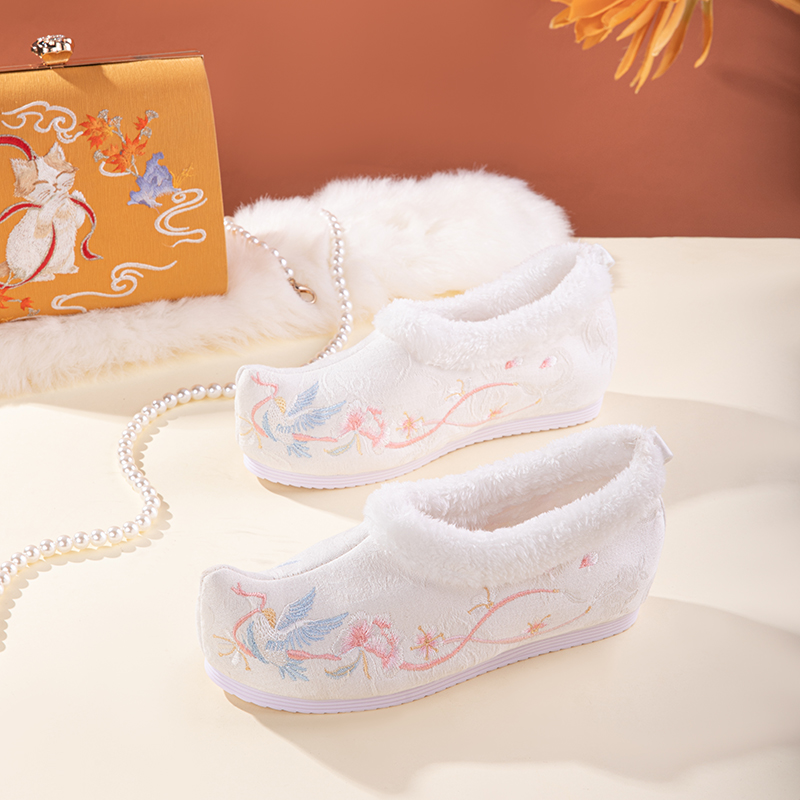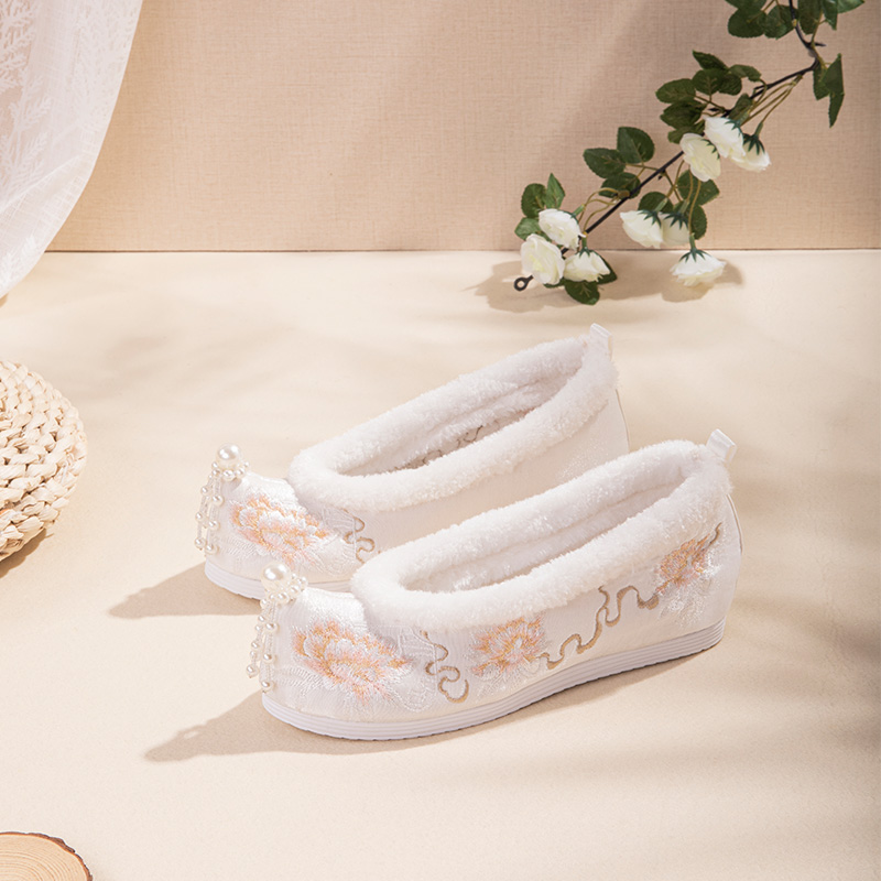 汉服鞋子女原创秋冬加绒内增高中国风复古棉鞋古装鞋白色绣花布鞋