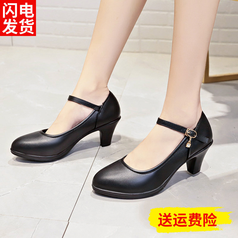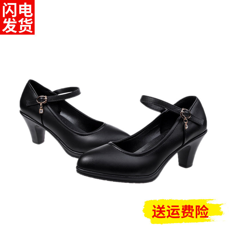 一字扣带职业面试高跟鞋子女细跟通勤正装圆头小皮鞋工作中跟单鞋