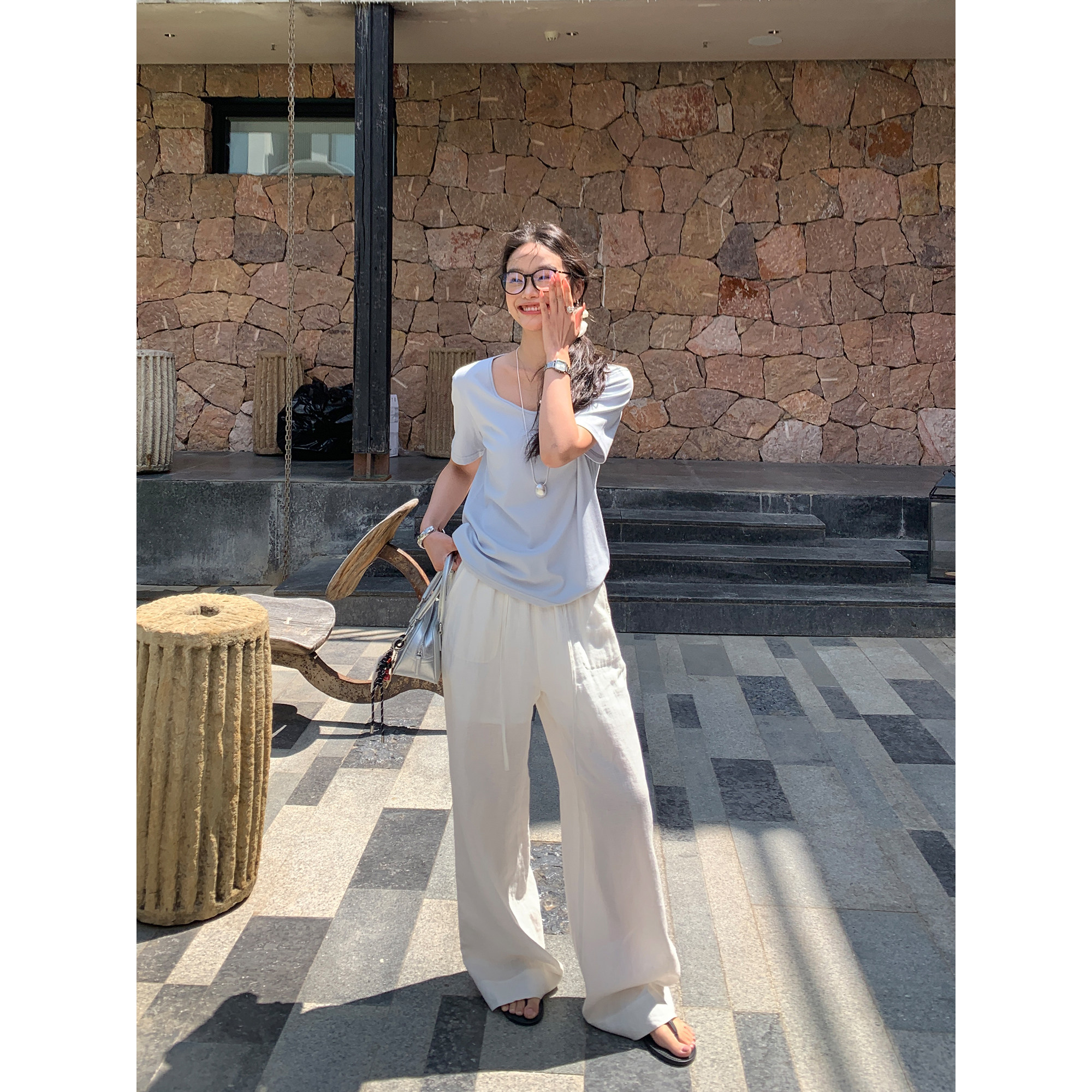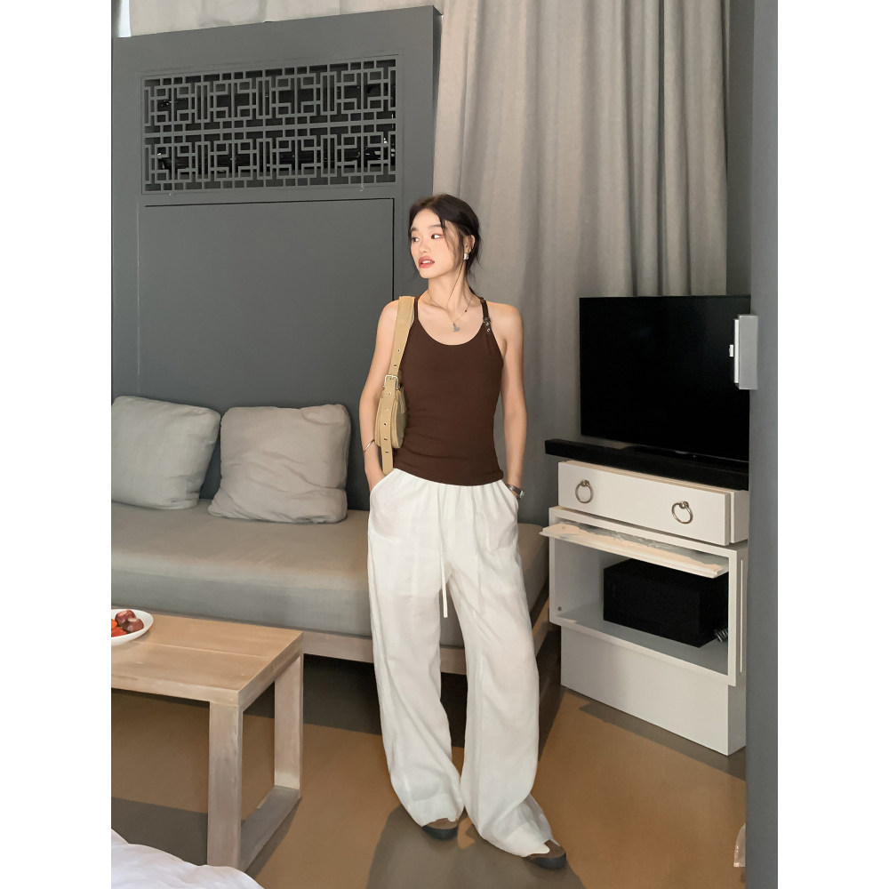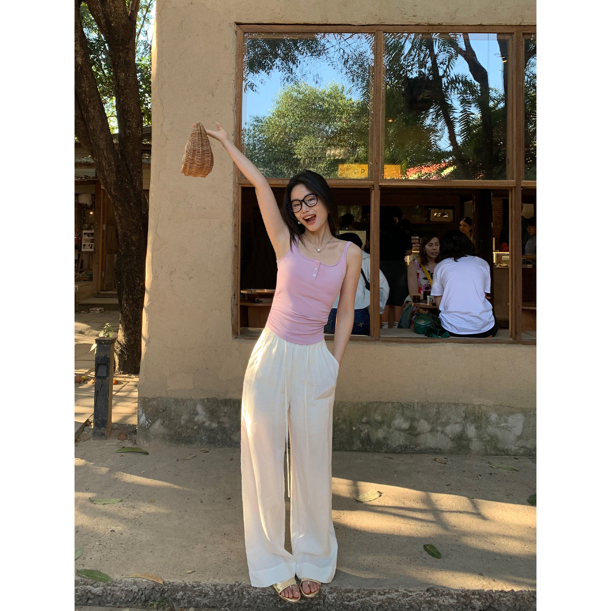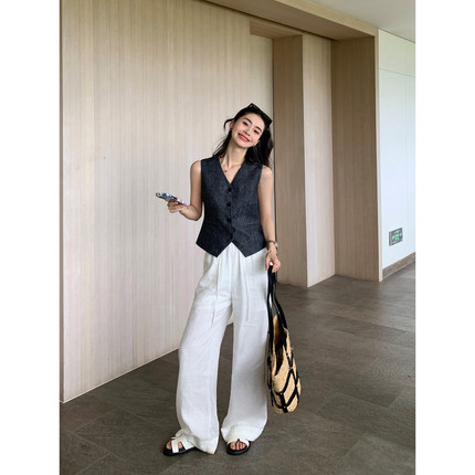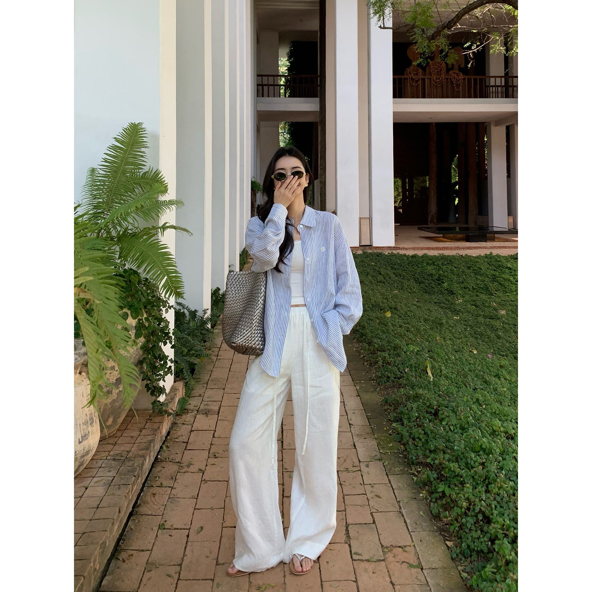 pusumede松弛感~100%亚麻阔腿休闲裤女薄款宽松抽绳气质慵懒长裤