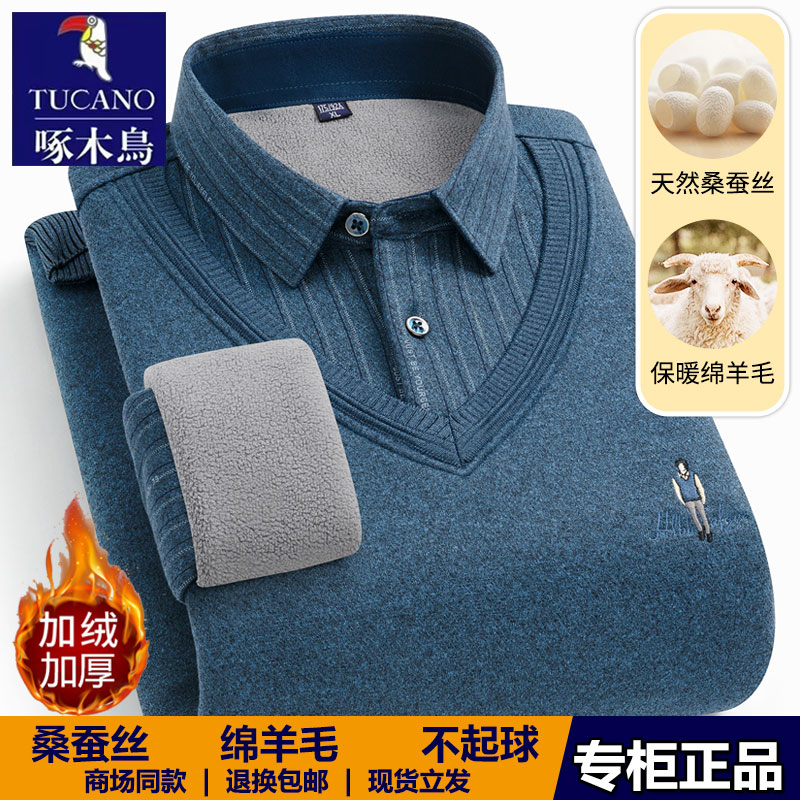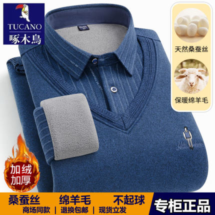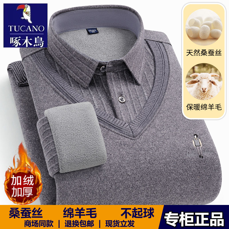 【含羊毛加绒加厚】啄木鸟男士翻领针织衫2025冬季假两件衬衫毛衣