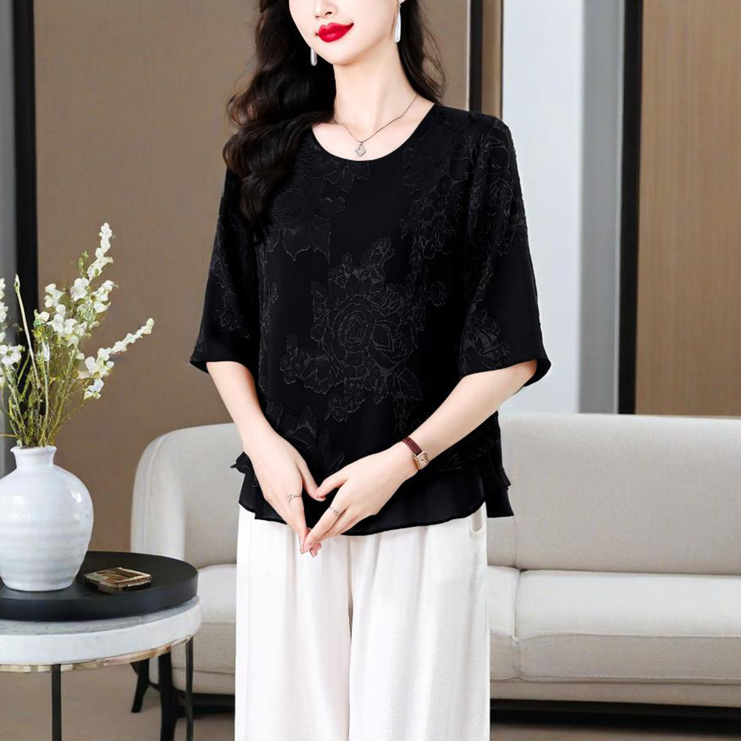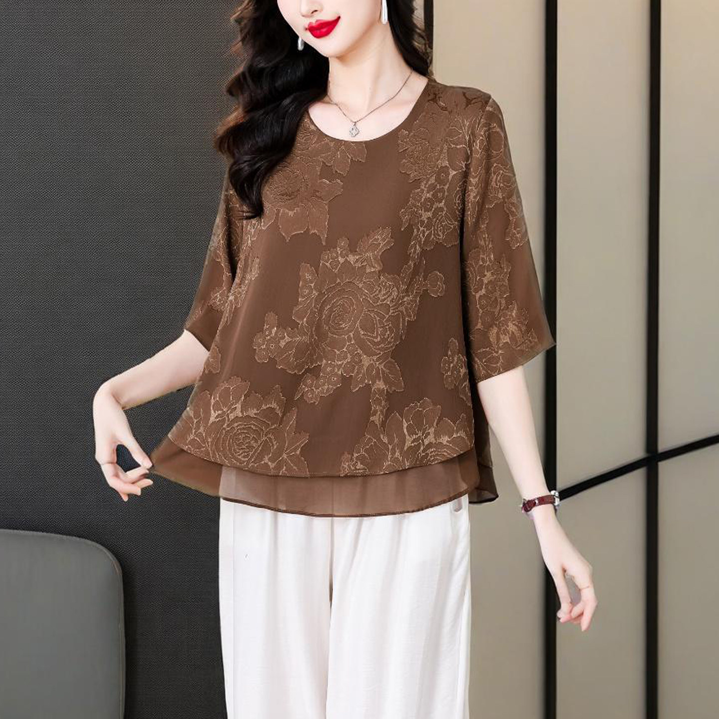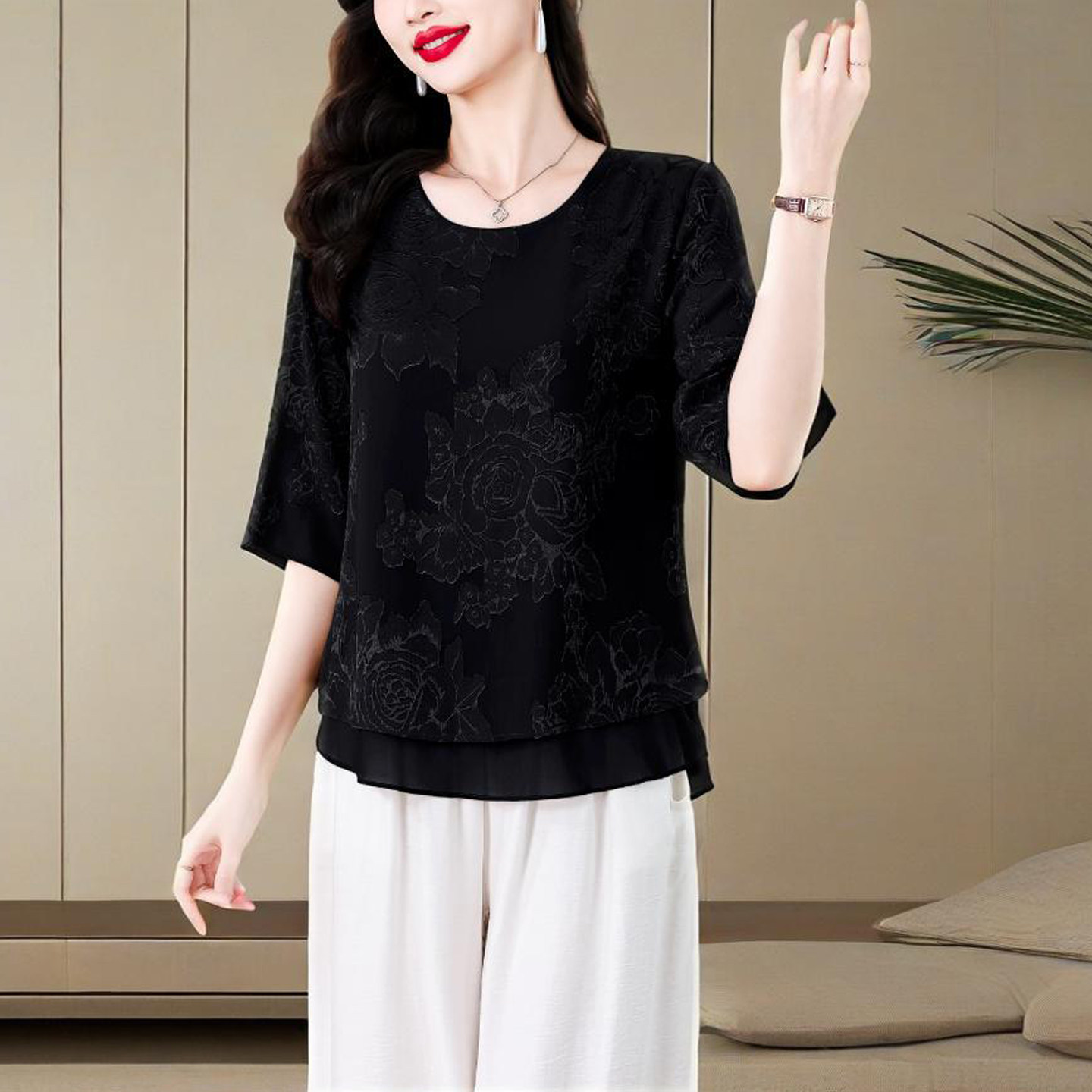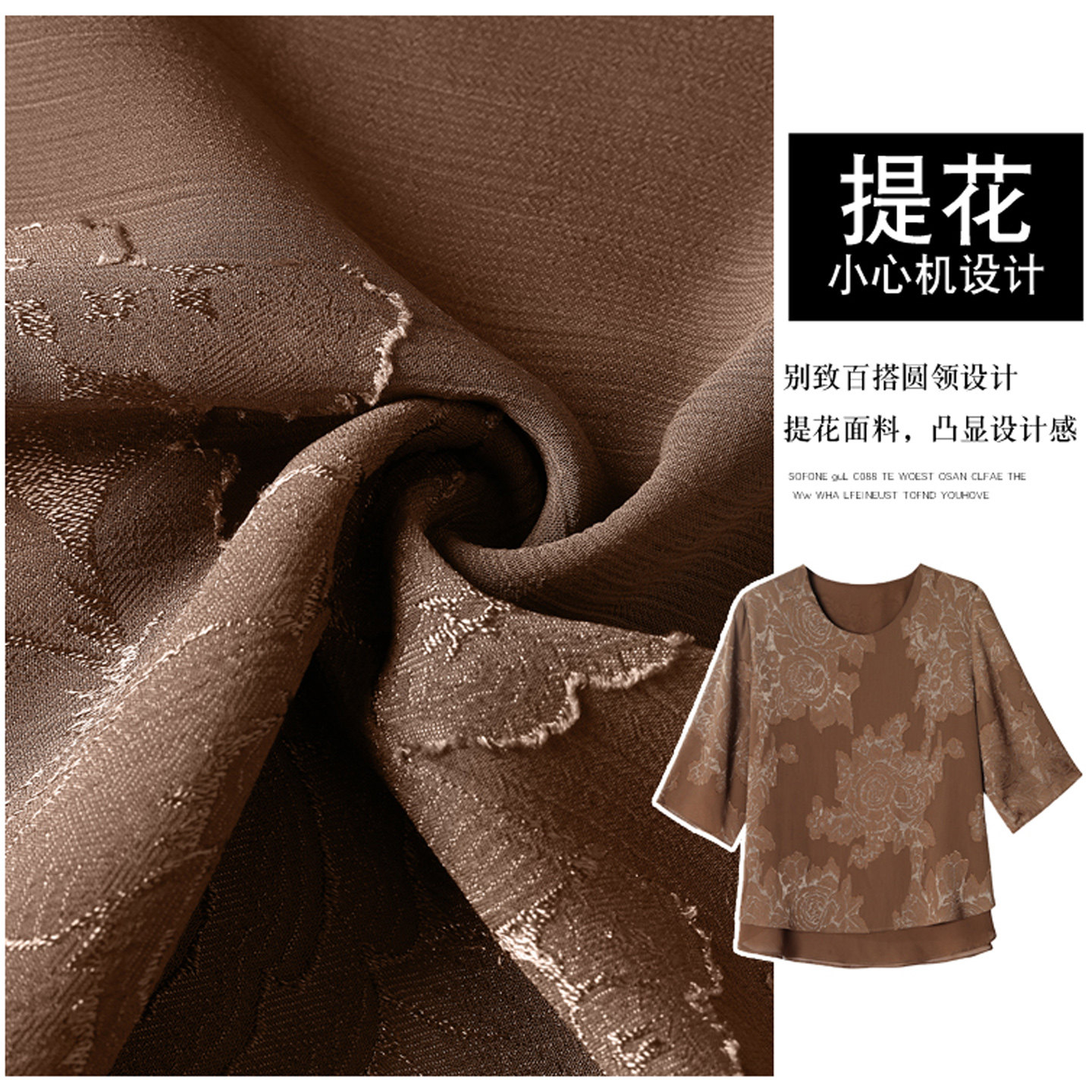 乔其纱双层提花中袖t恤衫女夏季新款大码胖MM宽松显瘦妈妈上衣