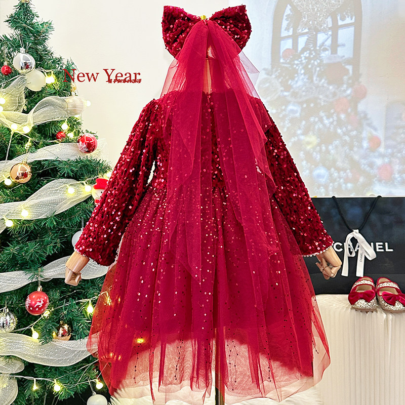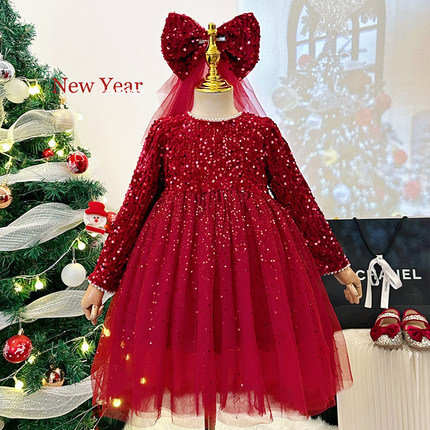 女童连衣裙秋冬儿童高级感洋气亮片公主裙女孩红色新年加绒礼服裙