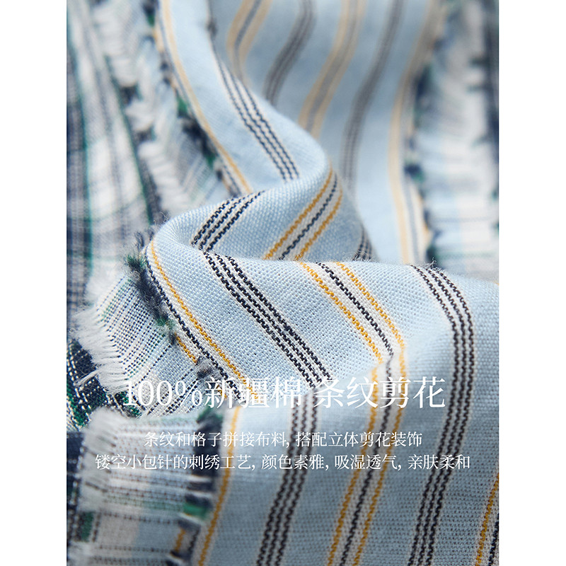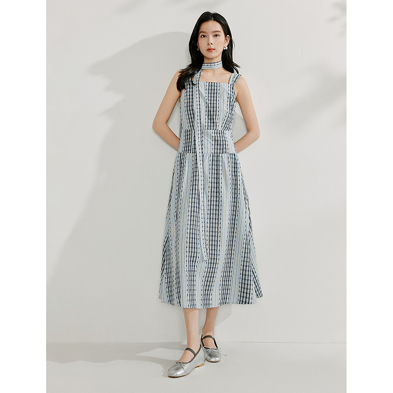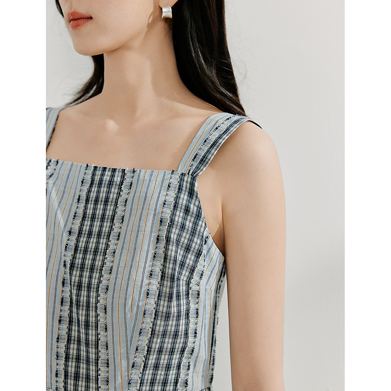 茵曼夏季格子剪花拼接无袖连衣裙女宽松背心中长裙子
