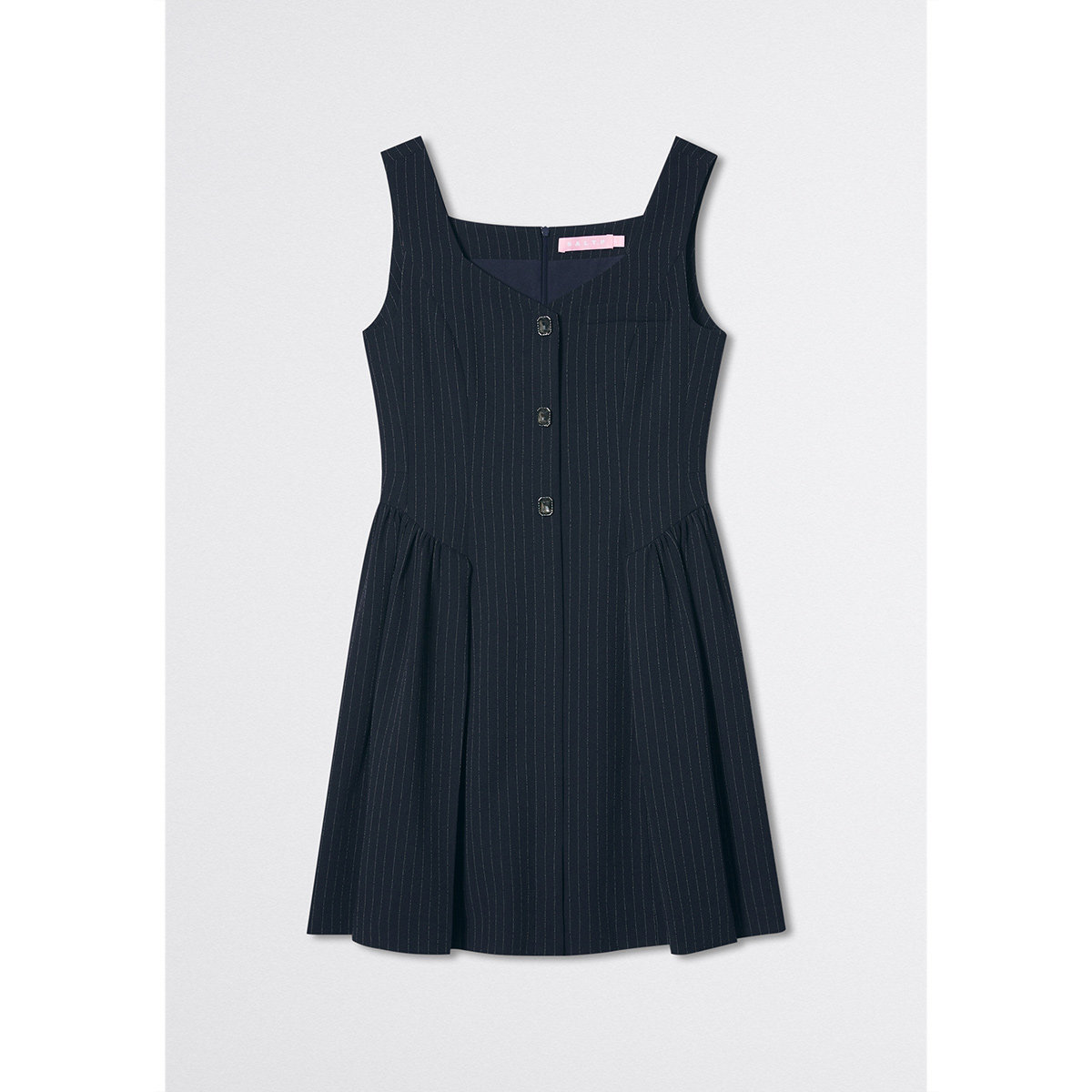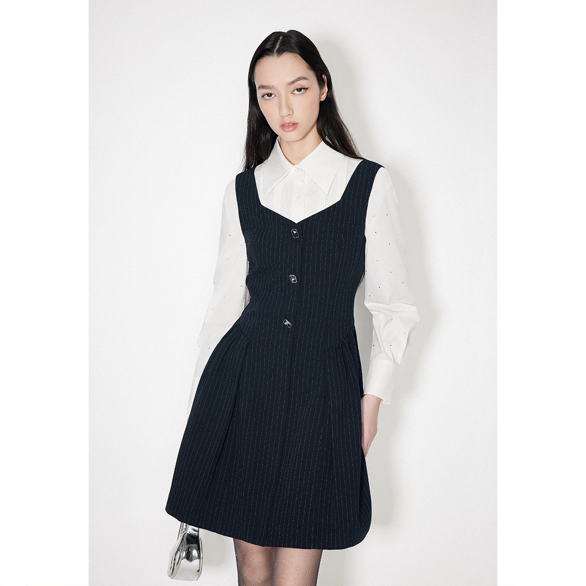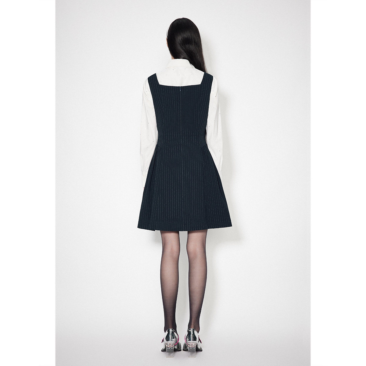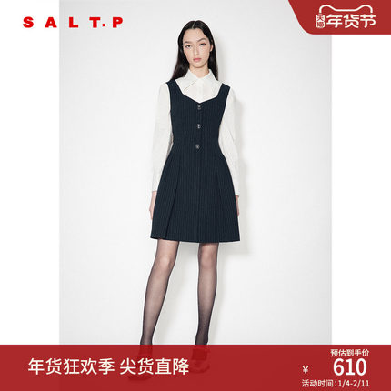 SALT.P可颜v领收腰修身显瘦复古条纹背带裙连衣裙2024秋