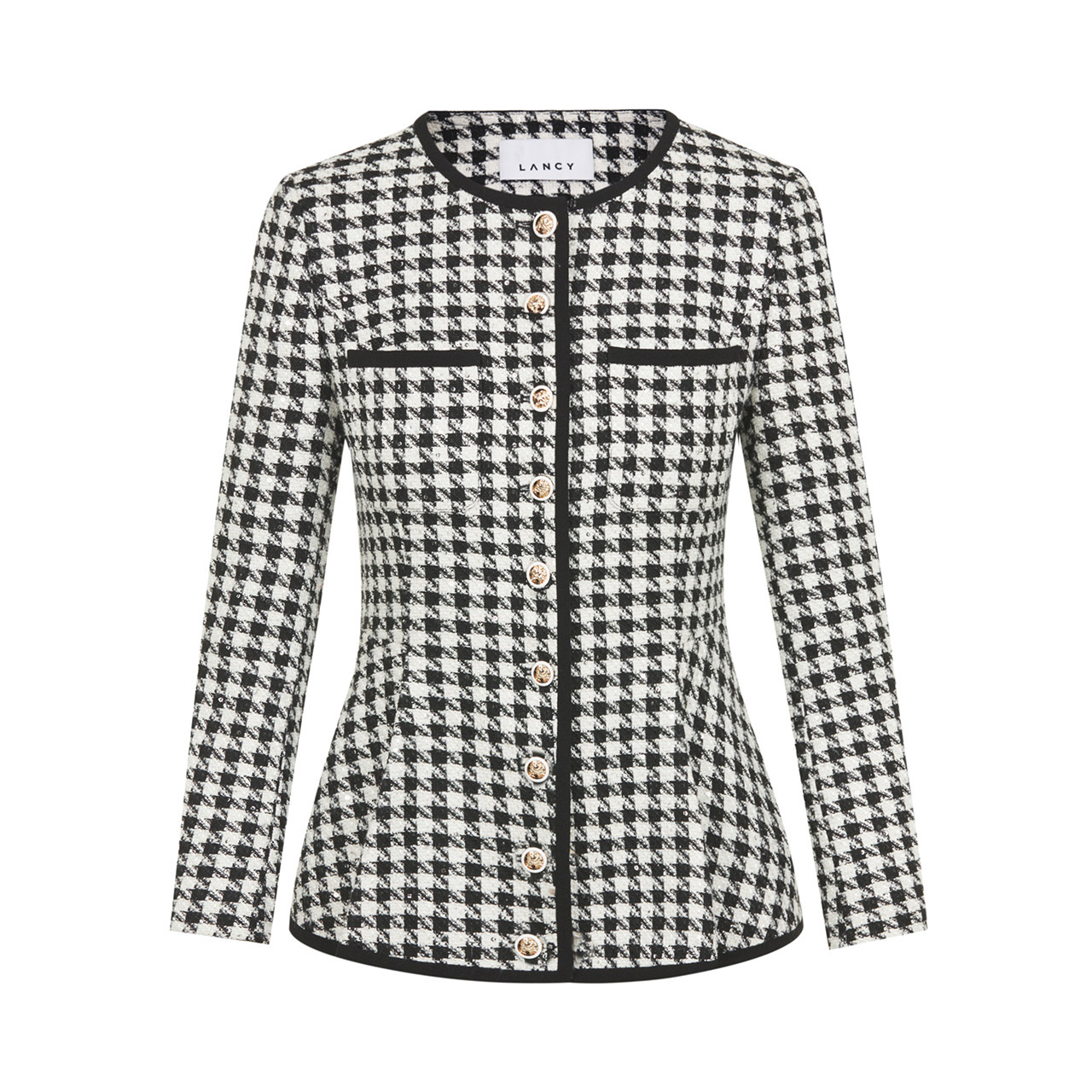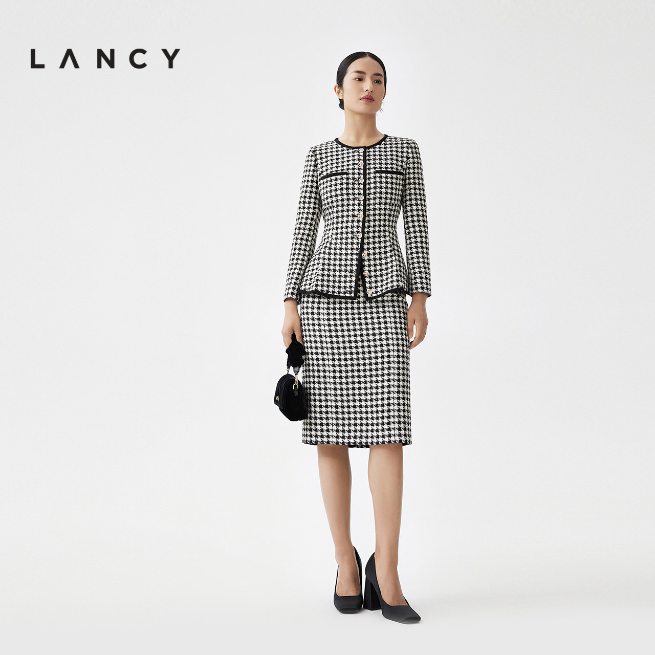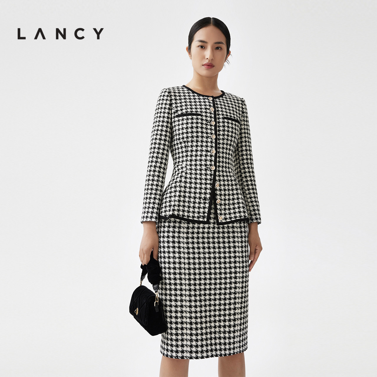 LANCY/朗姿2023秋冬新款收腰小香风外套女黑白格子套装复古优雅