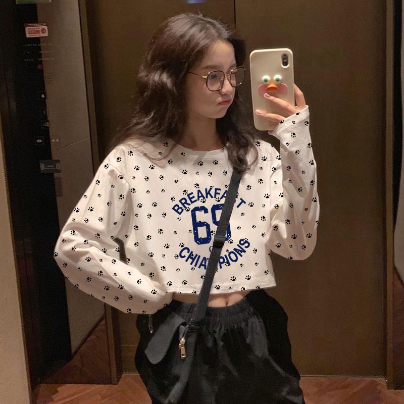 白色ins纯棉短款长袖T恤女生2025新款春季宽松圆领韩版印花上衣潮