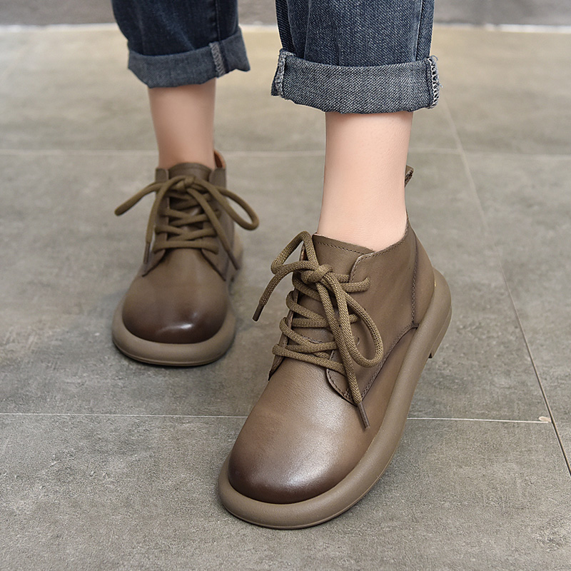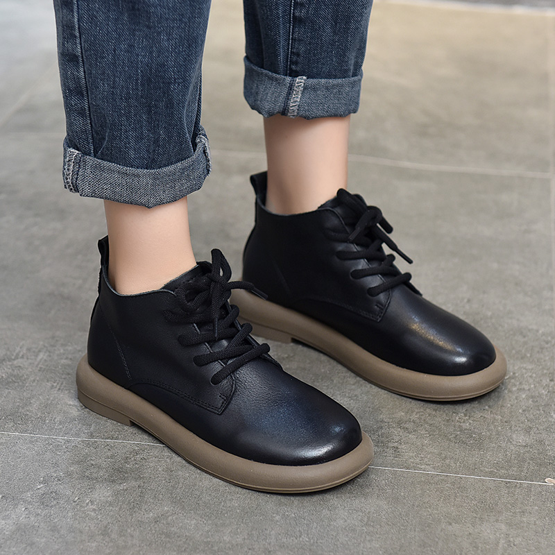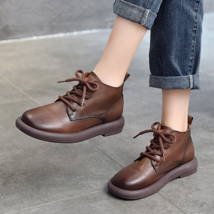 头层牛皮短靴女圆头平跟软皮2025秋冬新款复古百搭单靴系带马丁靴