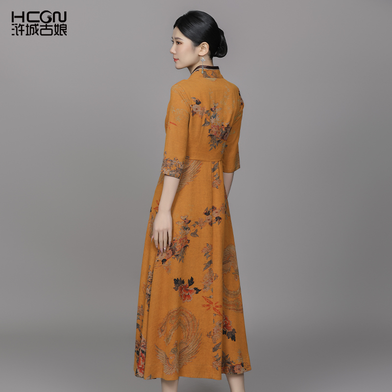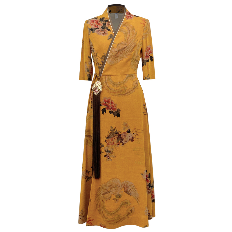 浒城古娘新款桑蚕丝真丝气质五分袖新中式国风香云纱连衣裙女夏季