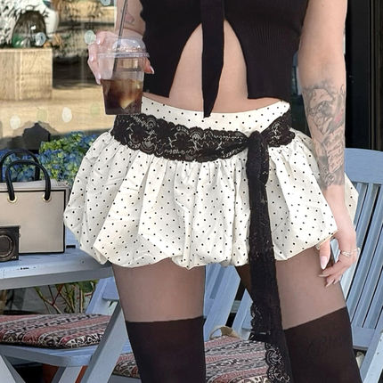 ROCKMORE【韩系纯欲】黑白撞色波点蕾丝拼接半身裙低腰辣妹花苞裙