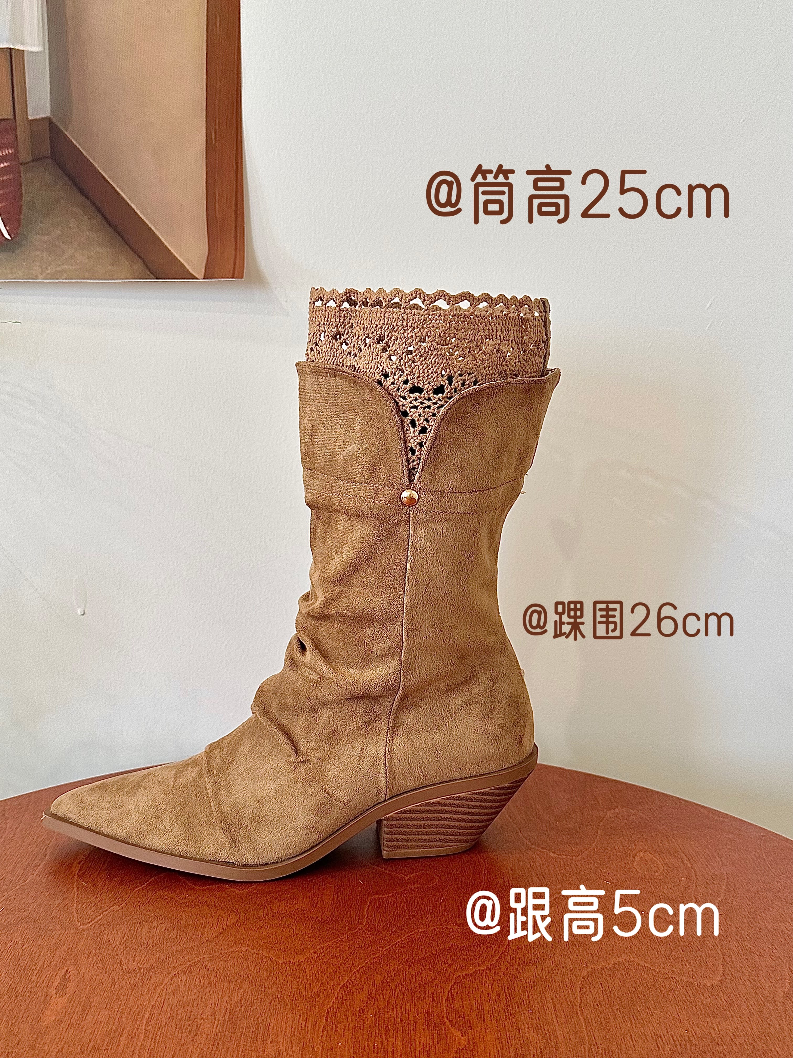 titing又被美到了!气质绒面尖头蕾丝堆堆靴女秋冬韩版粗跟短靴