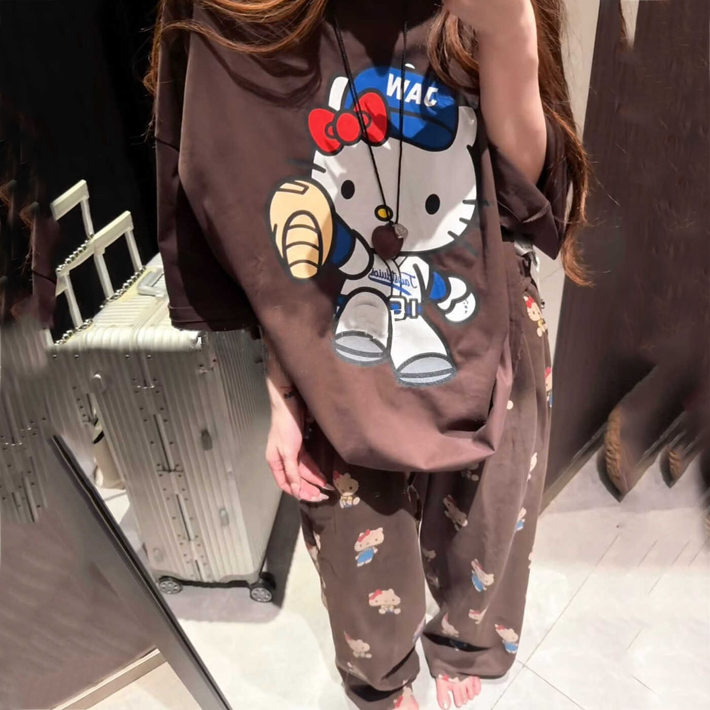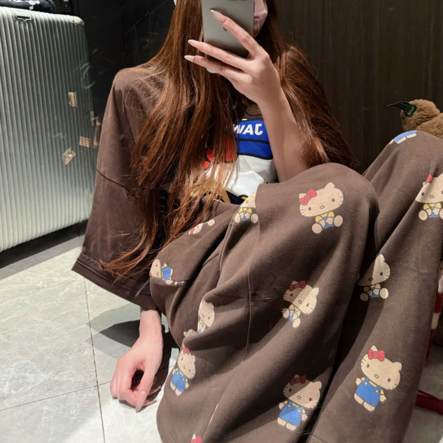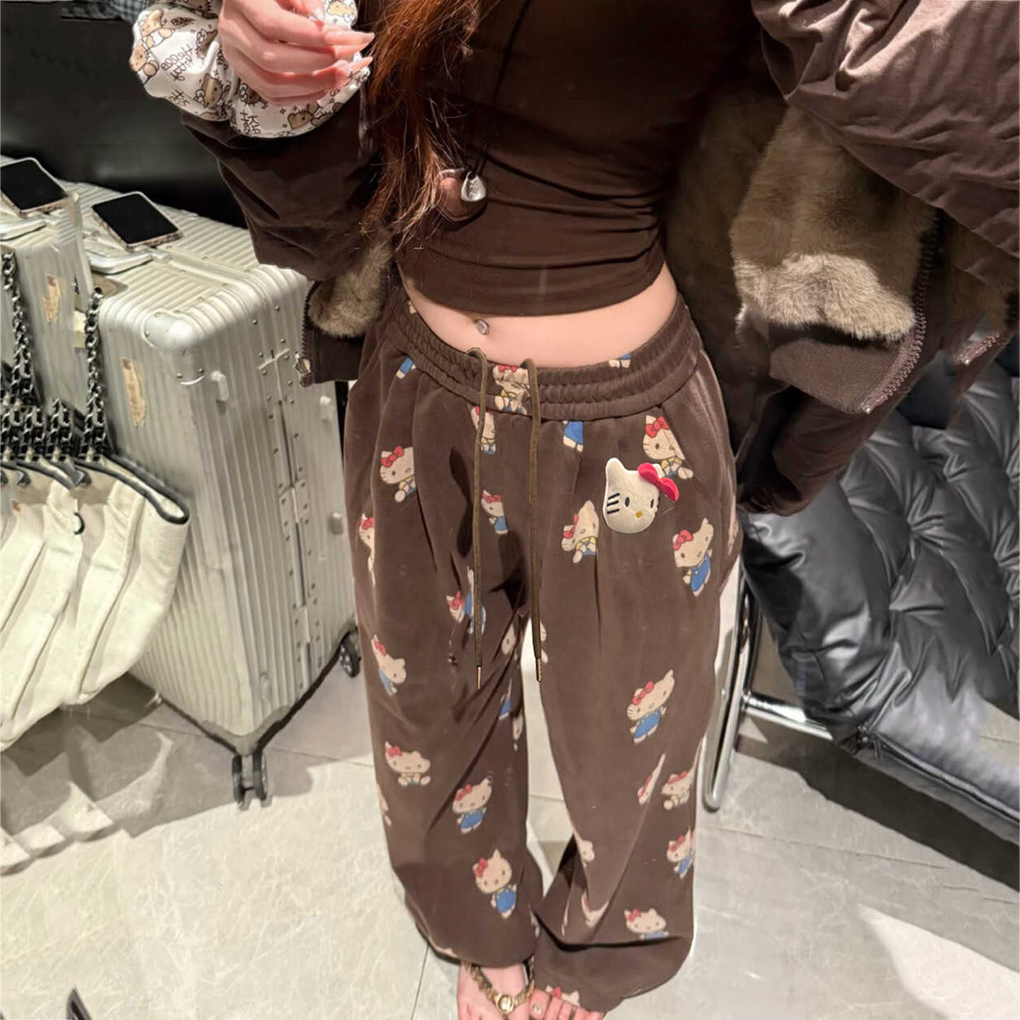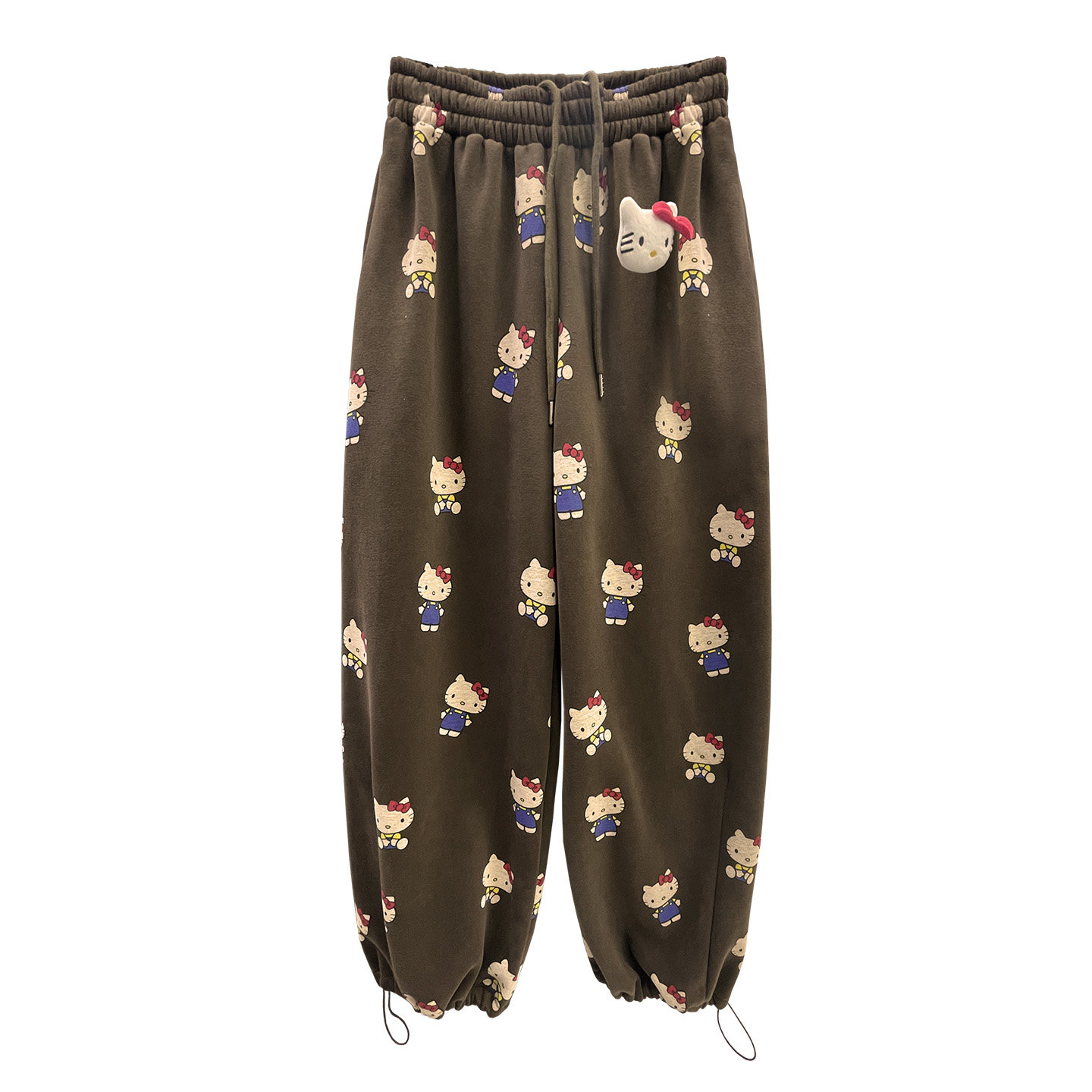 KT猫印花加绒加厚保暖卫裤女冬季高街慵懒阔腿抽绳两穿直筒束脚裤