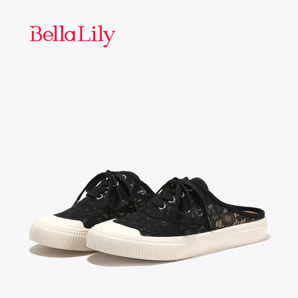 BellaLily新款蕾丝半包拖鞋女薄款一脚蹬帆布鞋复古板鞋子