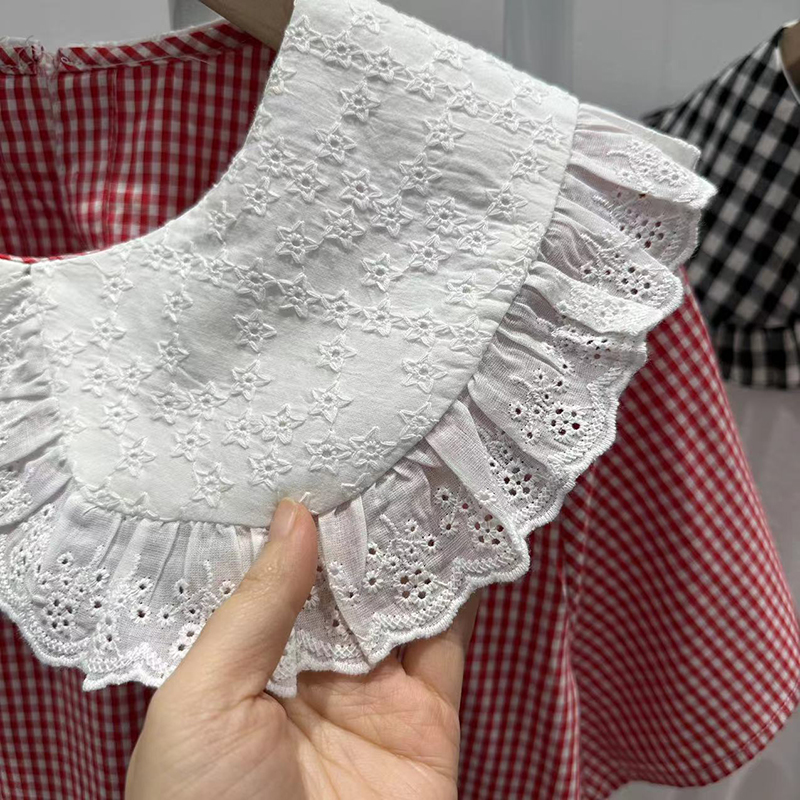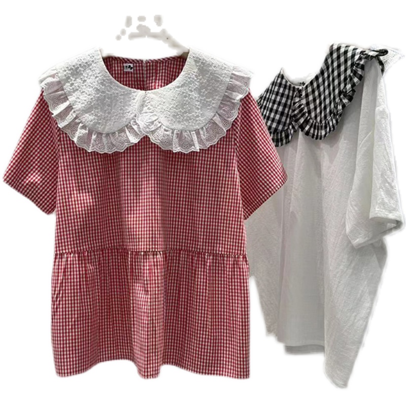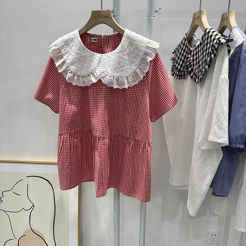 夏季新款红色格子娃娃衫白色蕾丝娃娃领棉布女上衣甜美短袖原创
