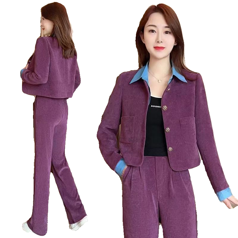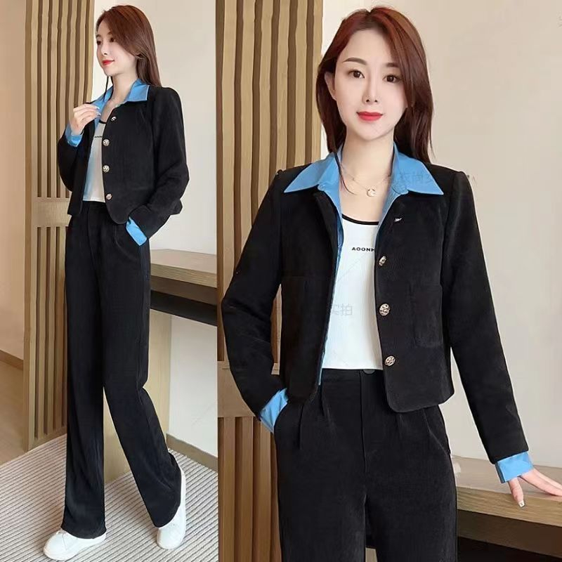 2024年春秋季洋气减龄显瘦假两件上衣阔腿裤时尚两件套休闲套装女