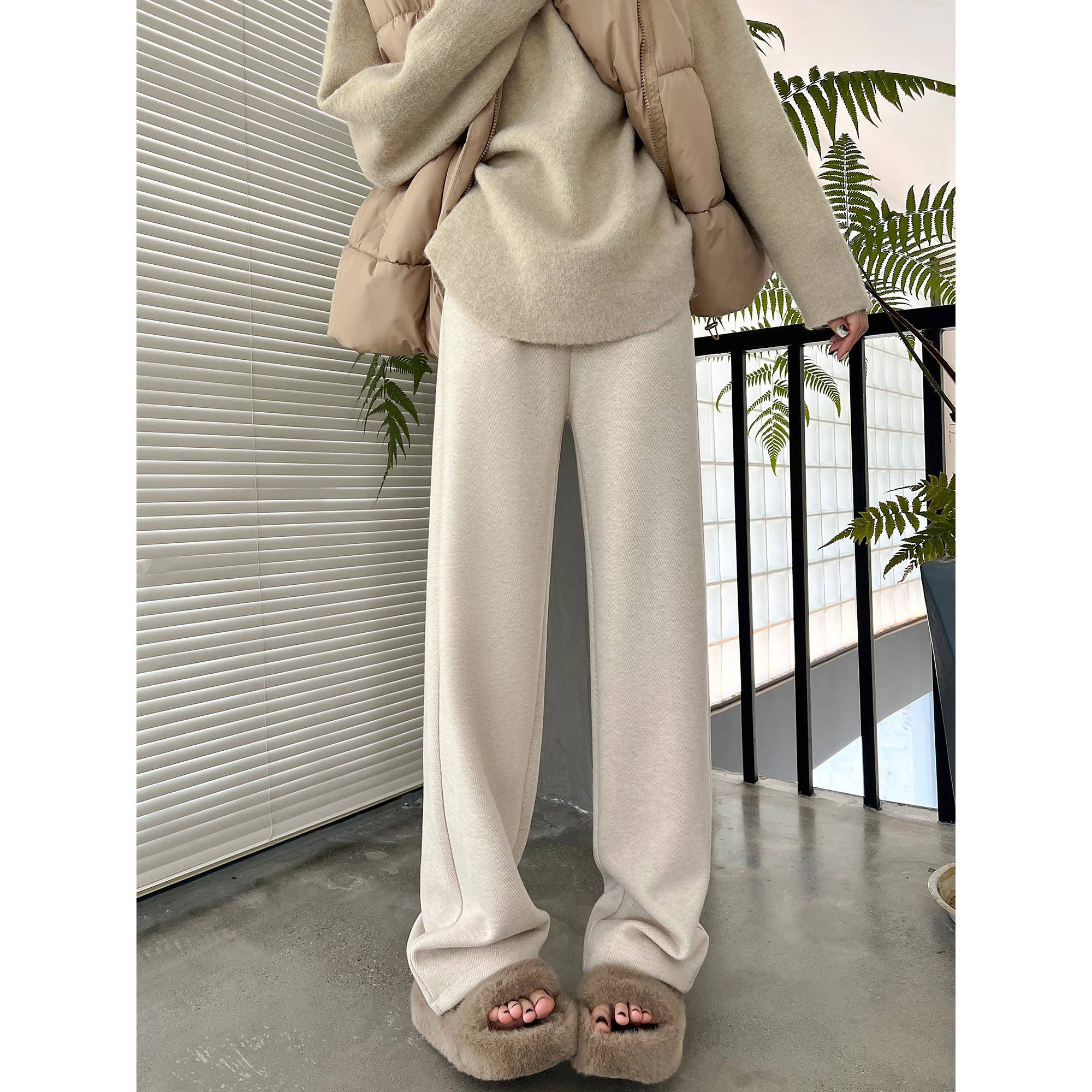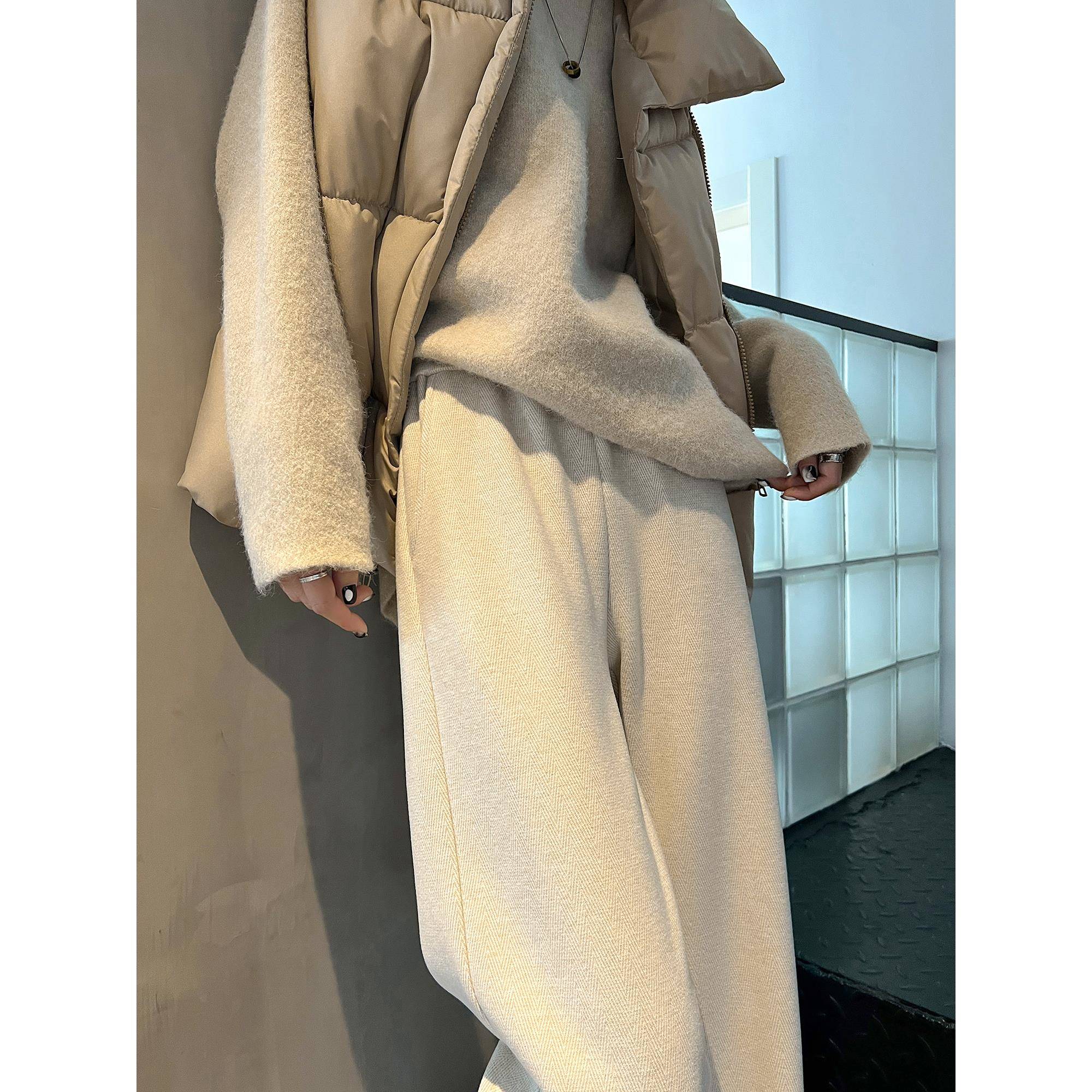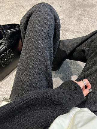 黑色毛呢窄版阔腿裤女2025春秋新款大码高腰休闲裤子人字纹直筒裤