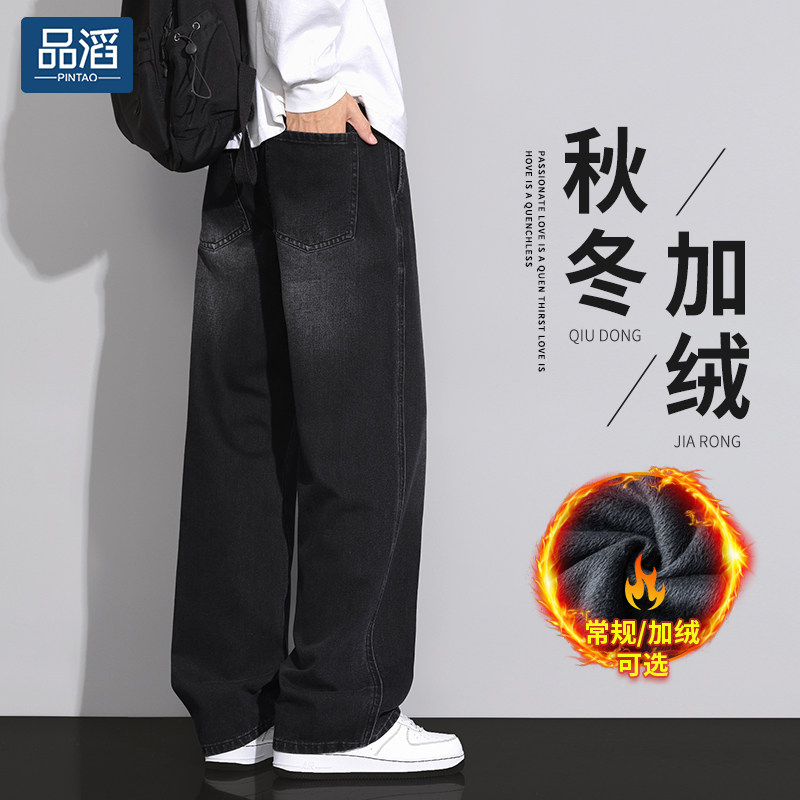 秋冬牛仔裤男款直筒宽松2025新款美式休闲青少年黑色加绒阔腿长裤
