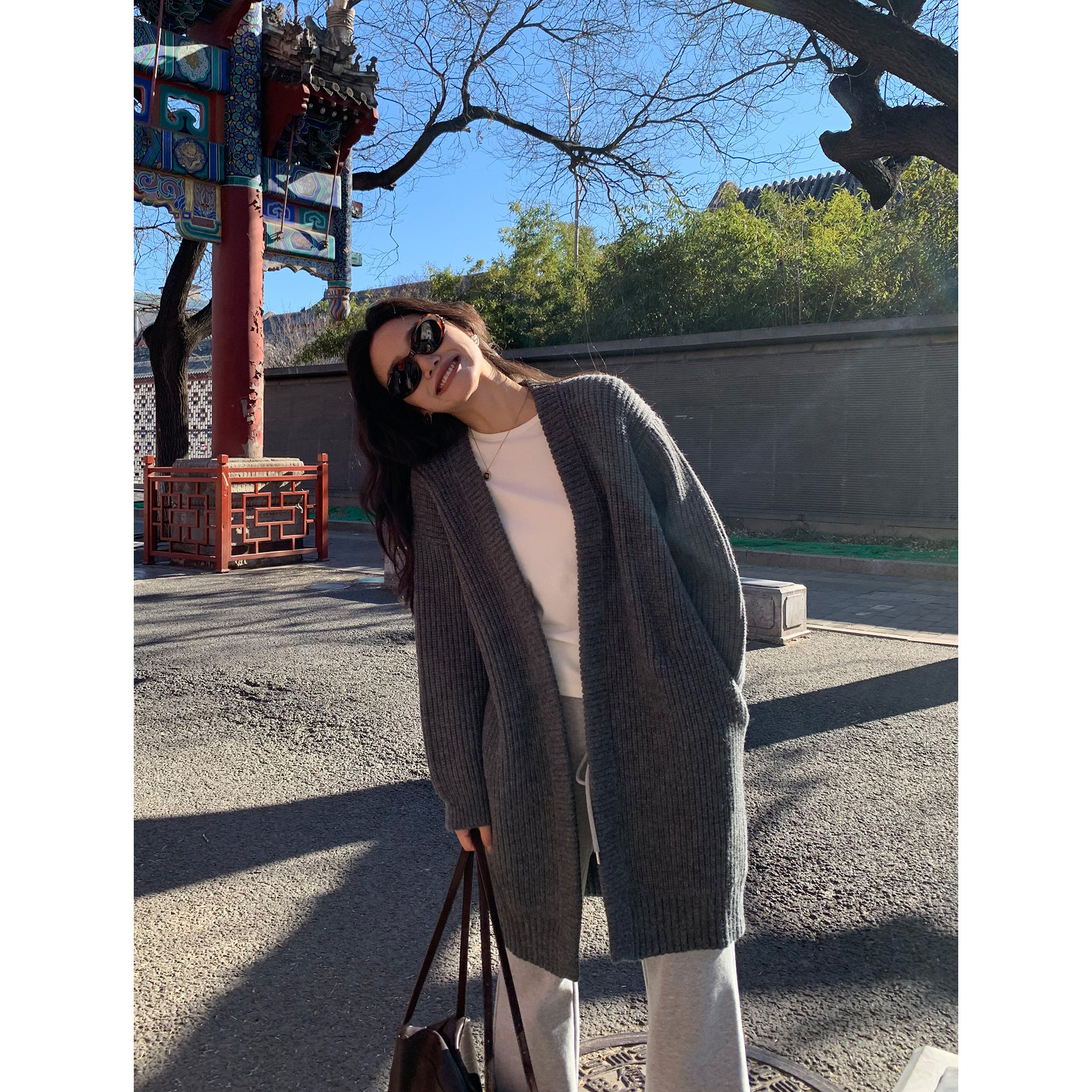 pusumede【现货7.5折】黑色毛衣开衫外套女慵懒风中长款针织上衣