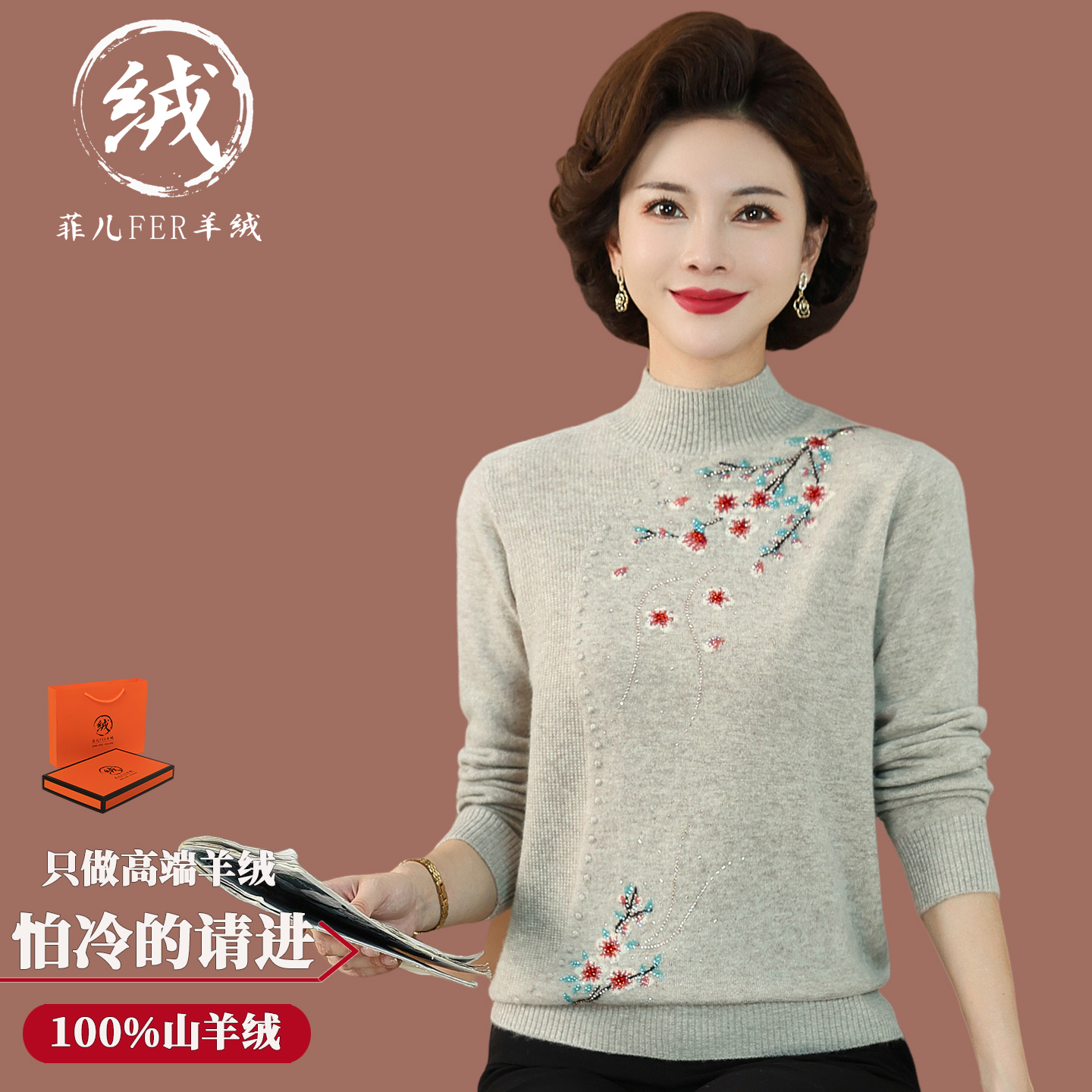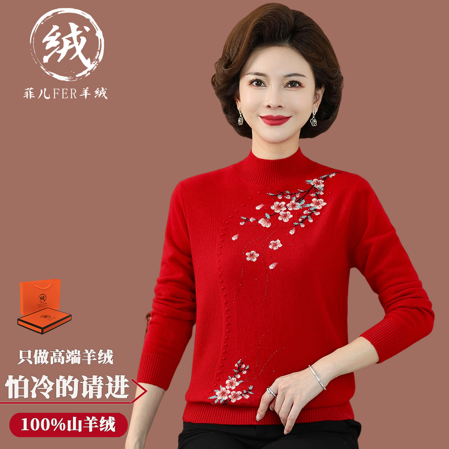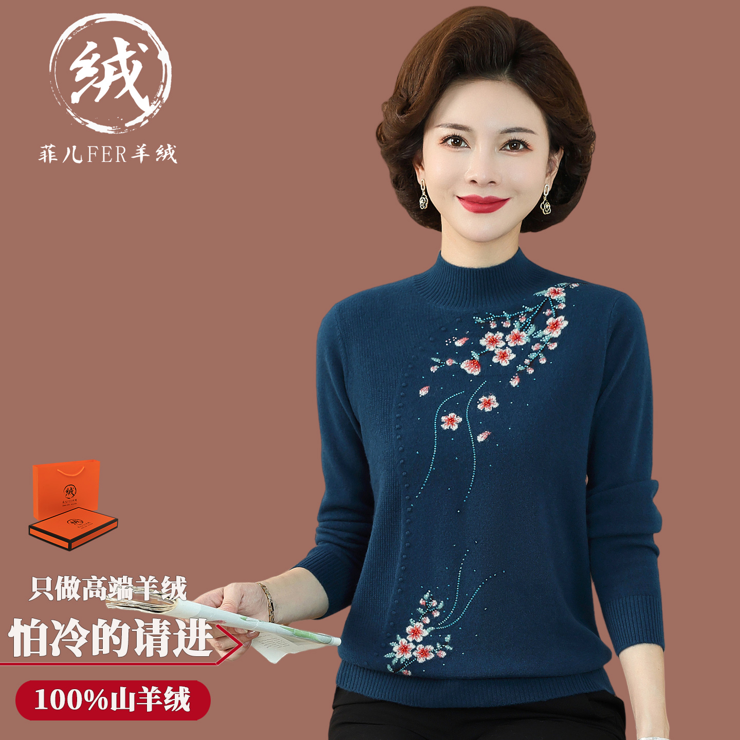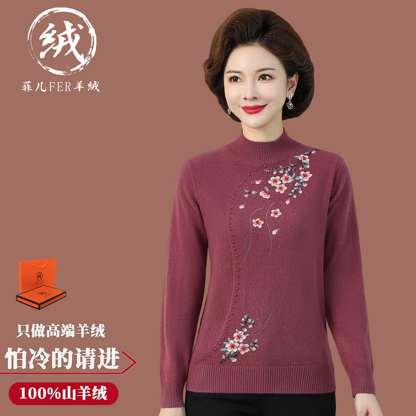 鄂尔多斯市100%纯羊绒衫女妈妈秋冬装大码加厚中老年人半高领毛衣